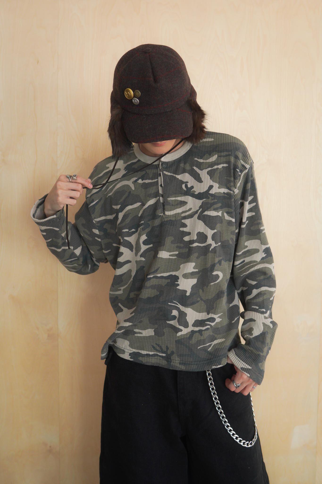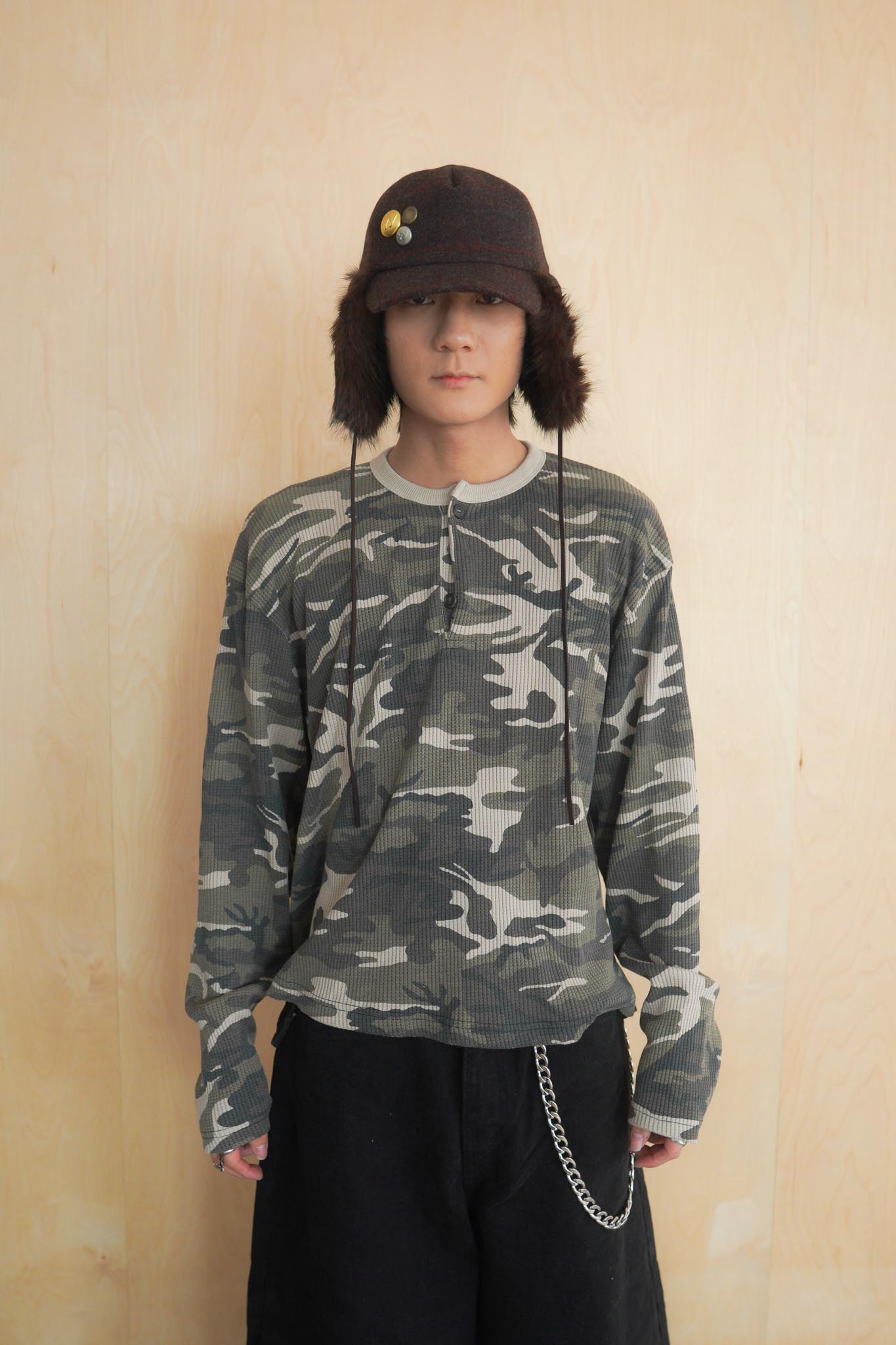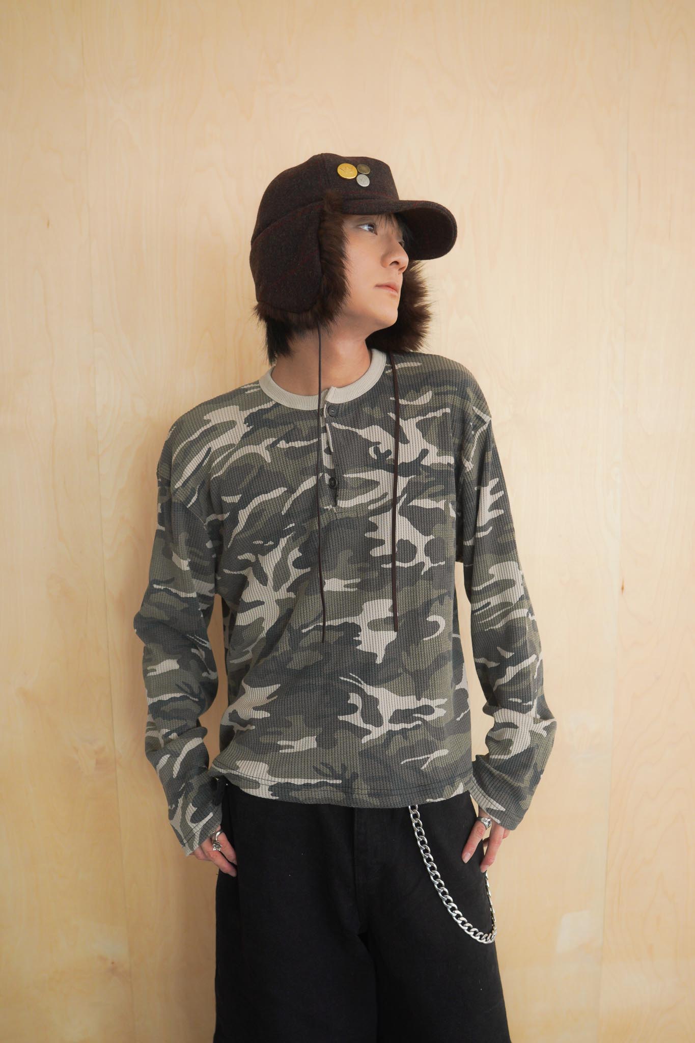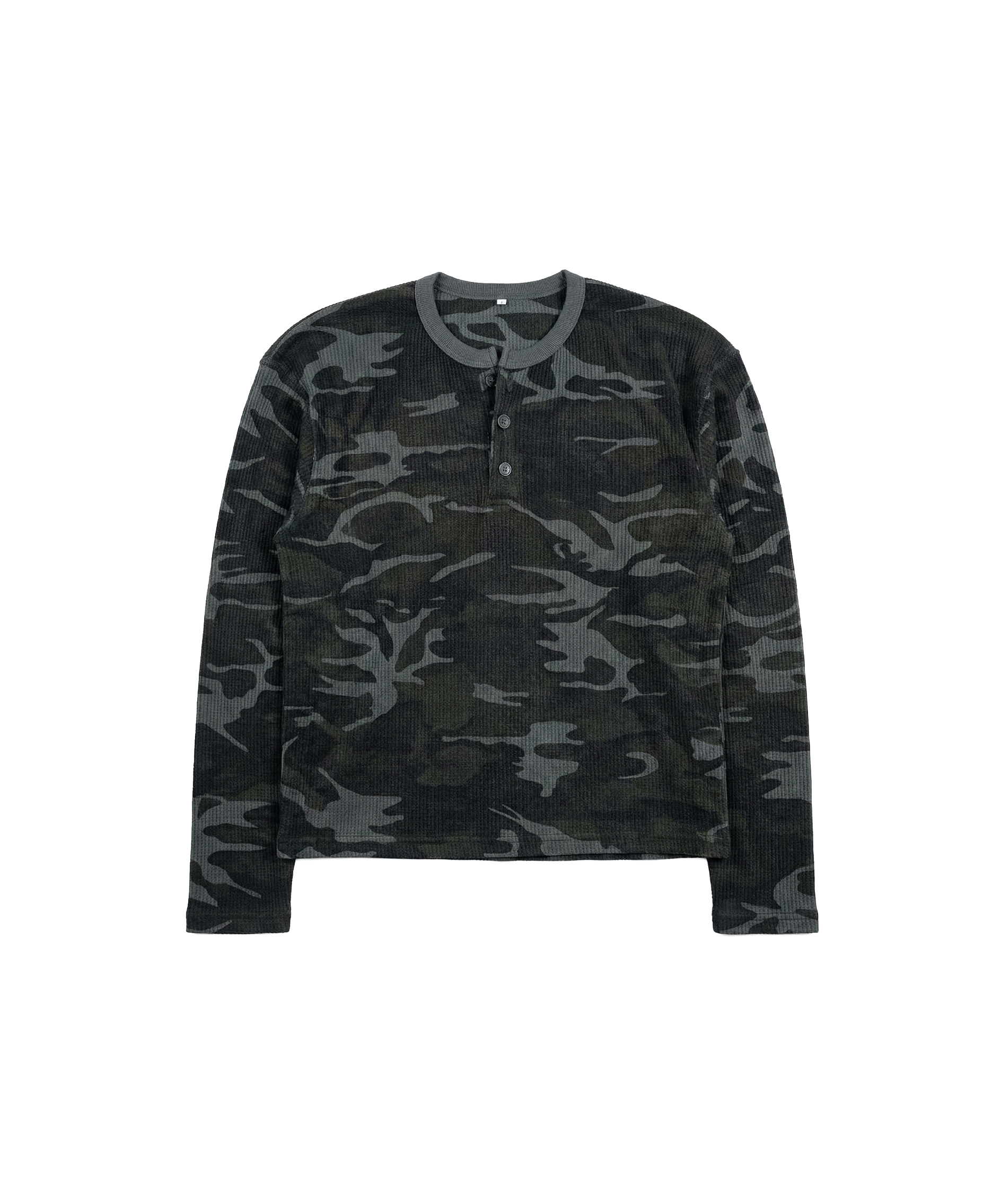韓國 迷彩 華夫格 短版 亨利領 長袖 上衣