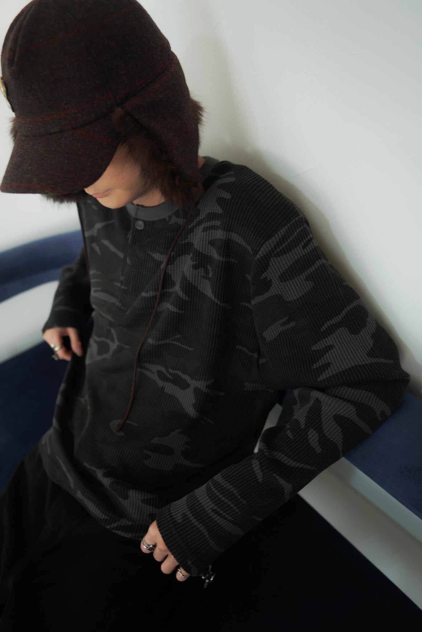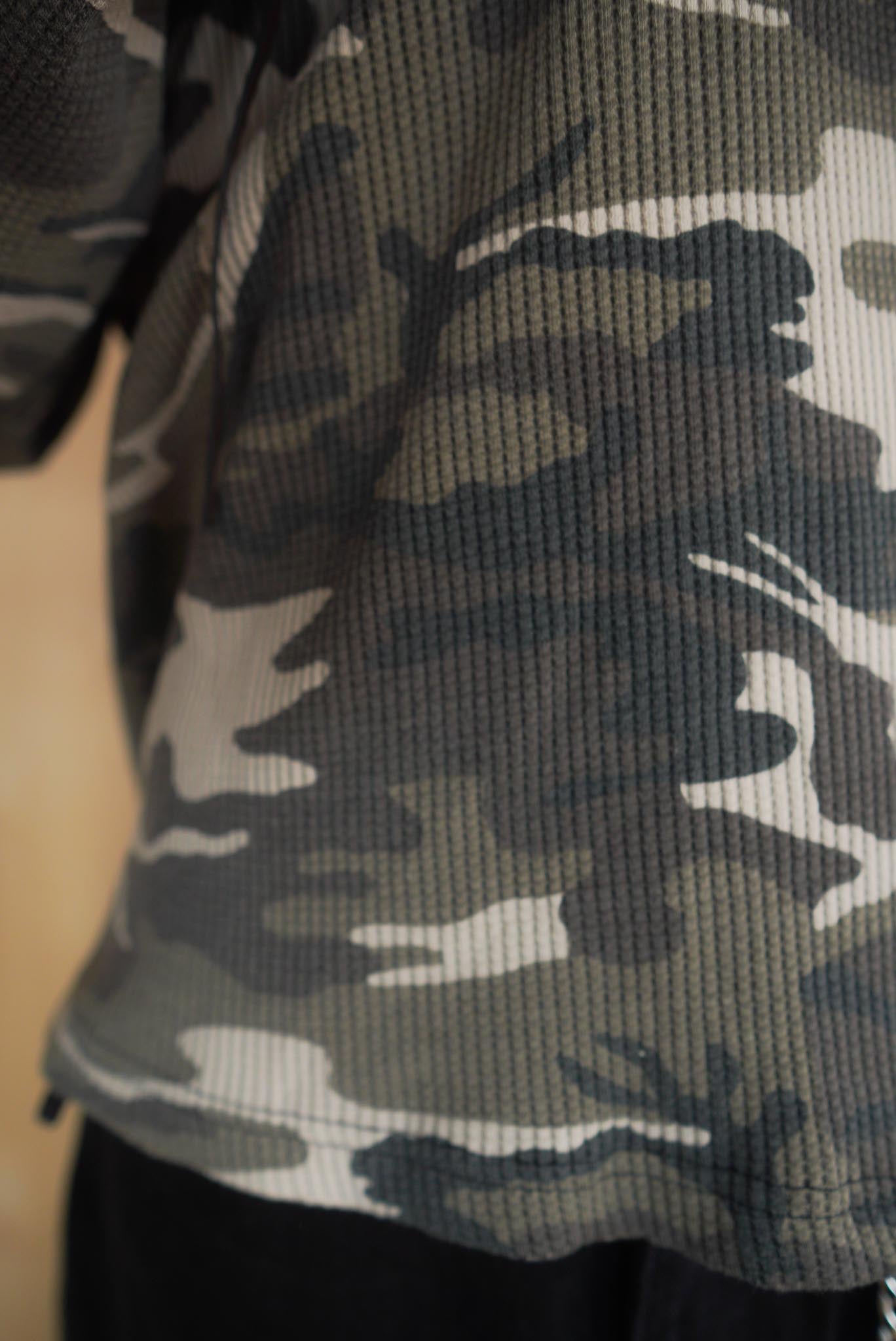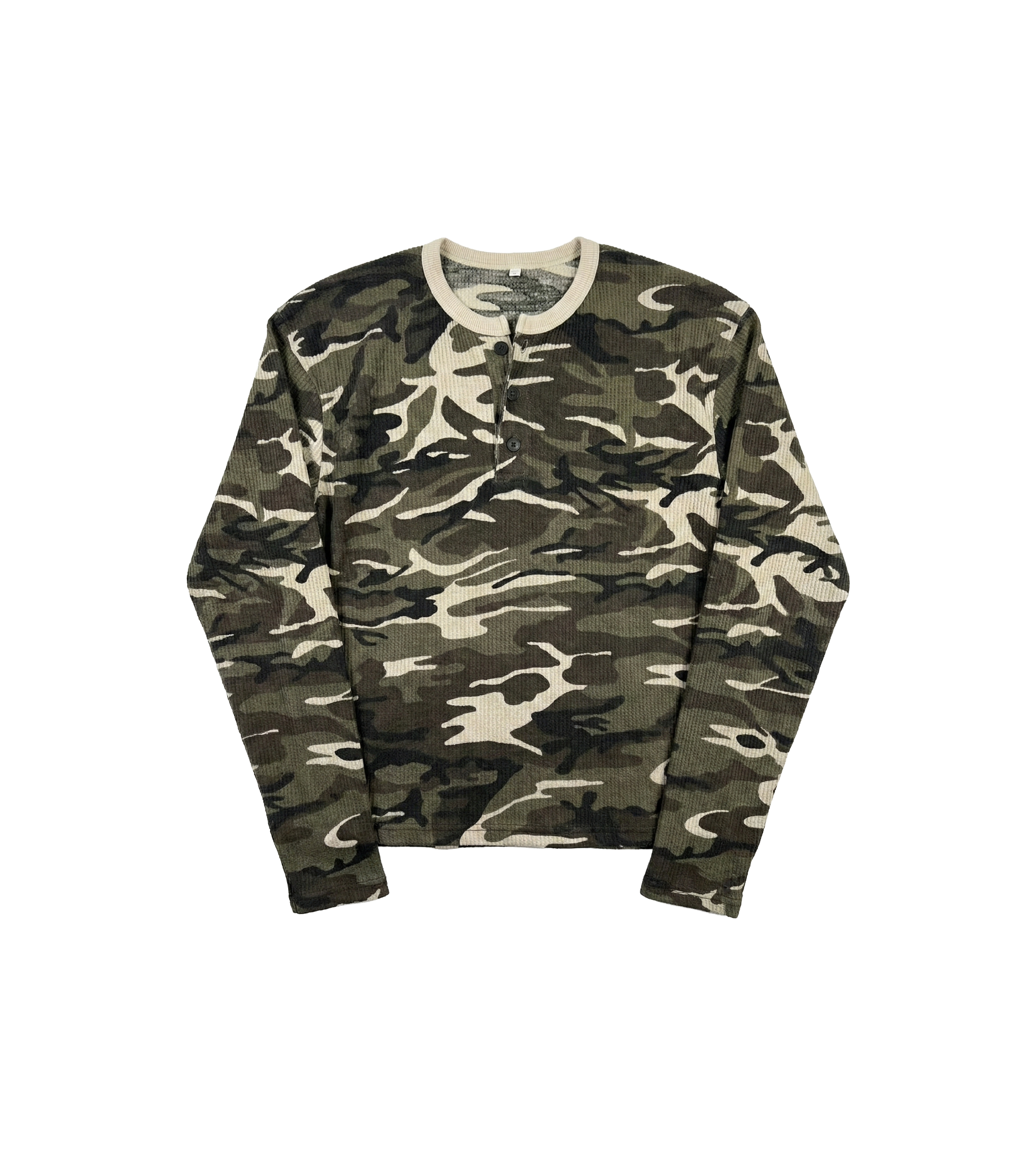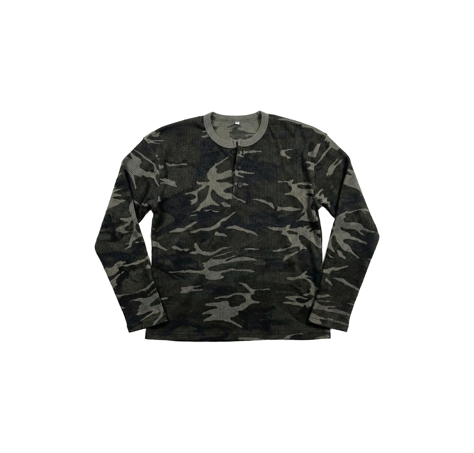 韓國 迷彩 華夫格 短版 亨利領 長袖 上衣