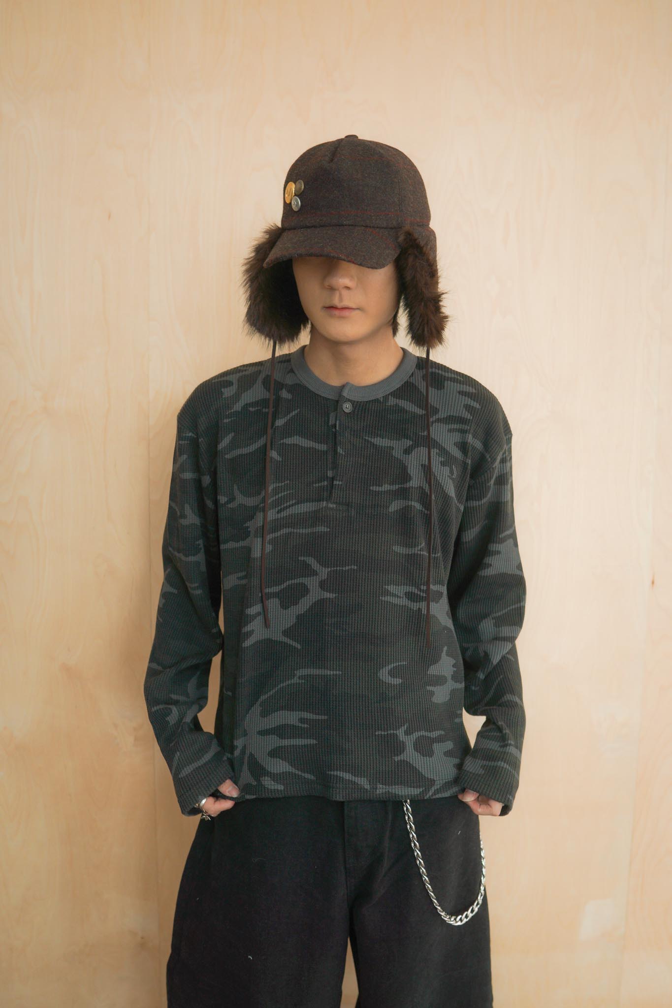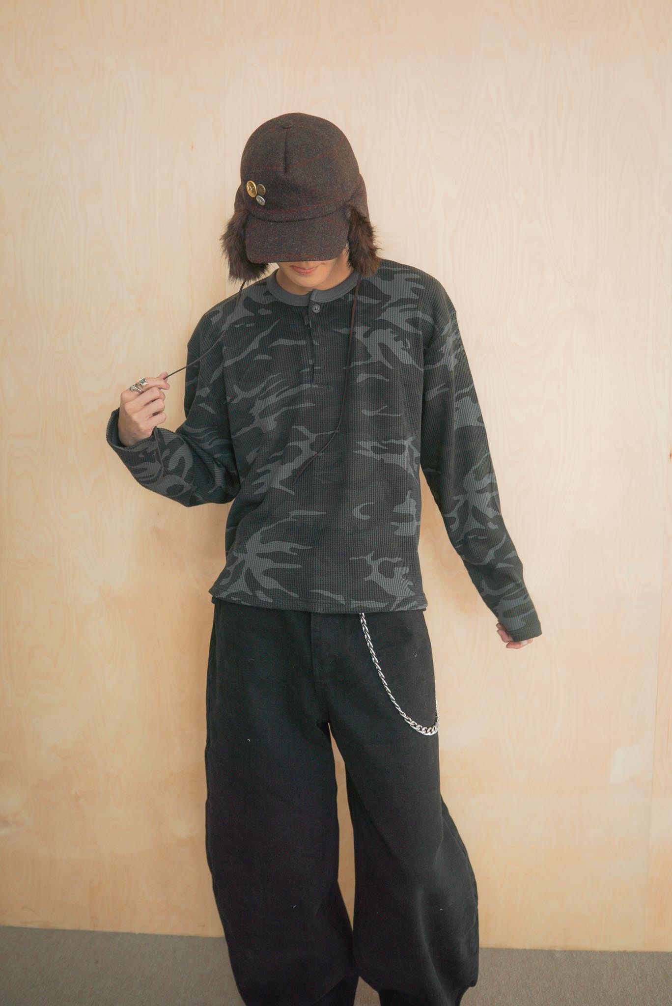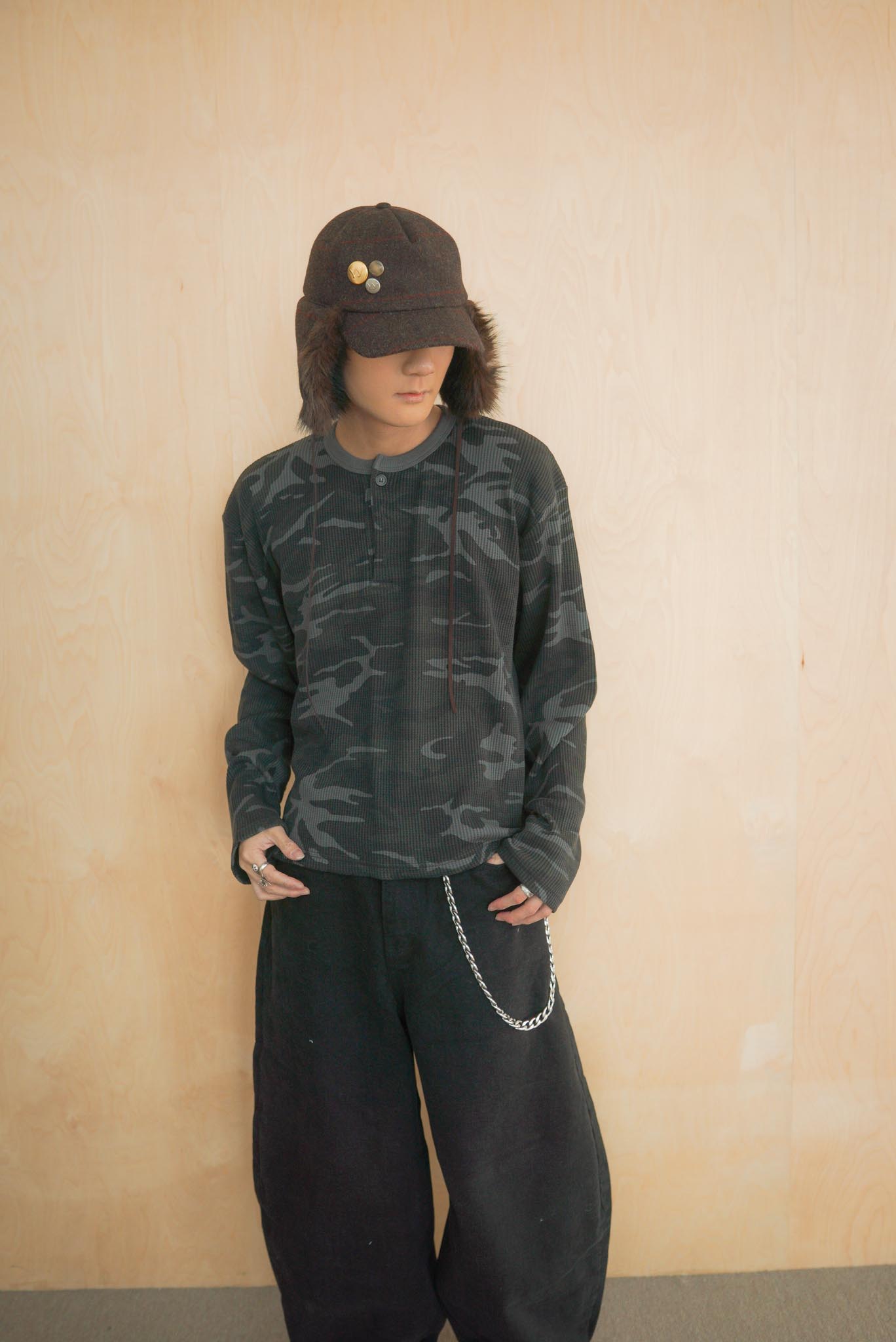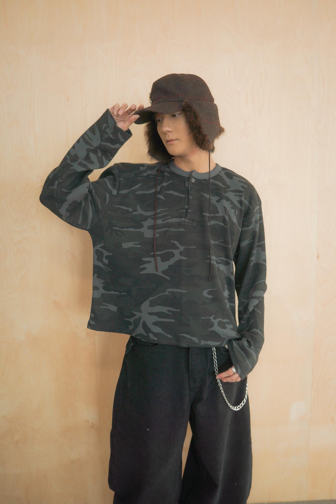 【GUBAN】T-C107 韓國 迷彩 華夫格 短版 亨利領 長袖 上衣