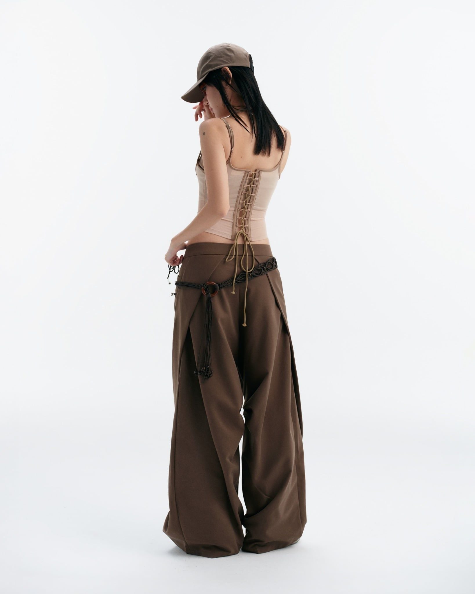 寬版直筒褲設計,兩側腰部帶有拼接垂片細節
