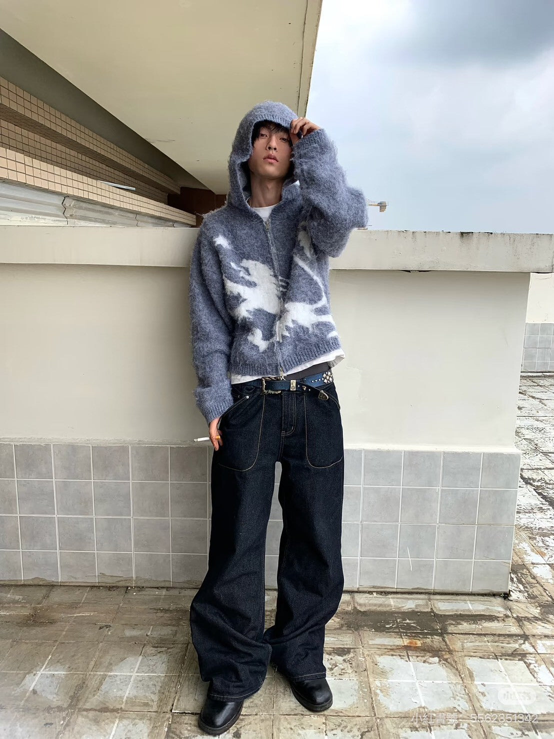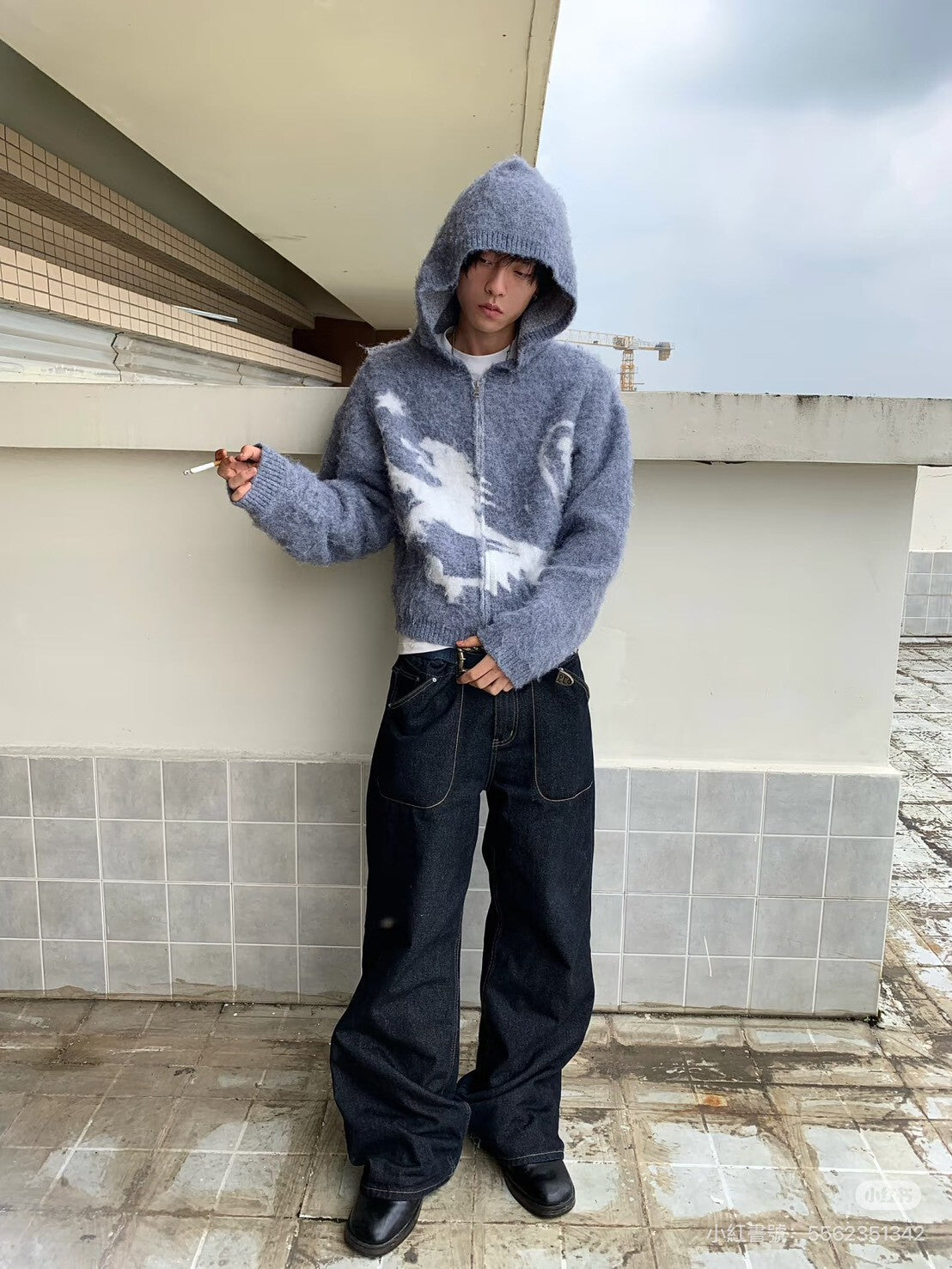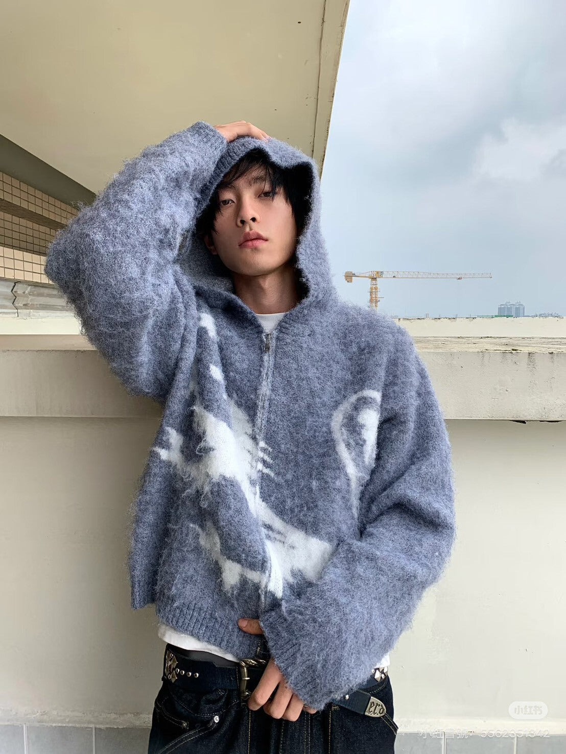 【GUBAN】J-A55 小眾 海馬毛 針織 提花 雙拉鍊 寬鬆 慵懶 連帽外套