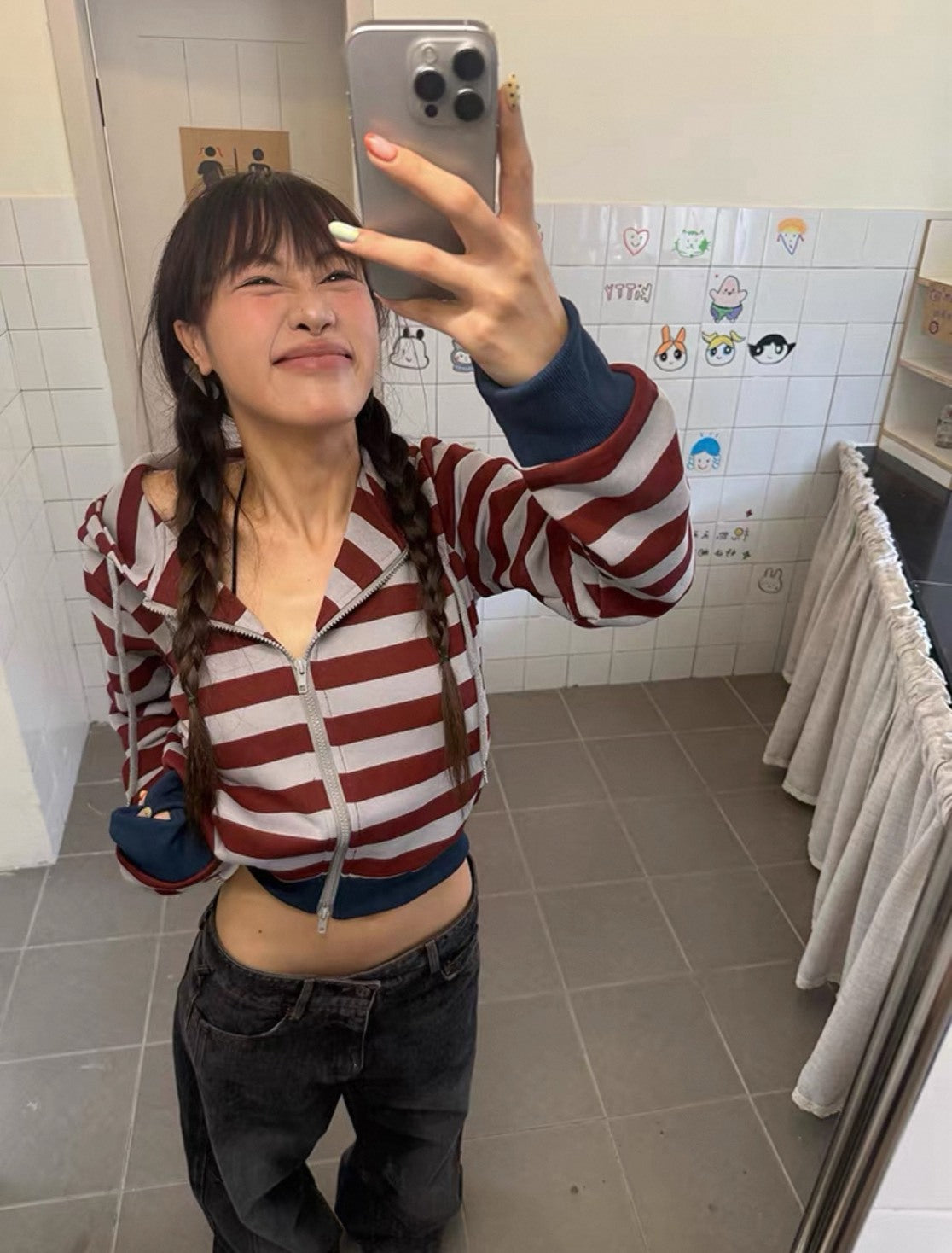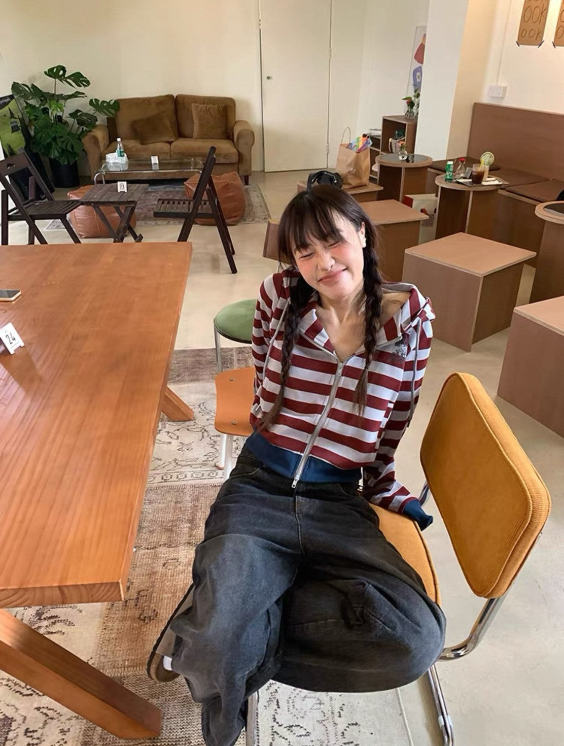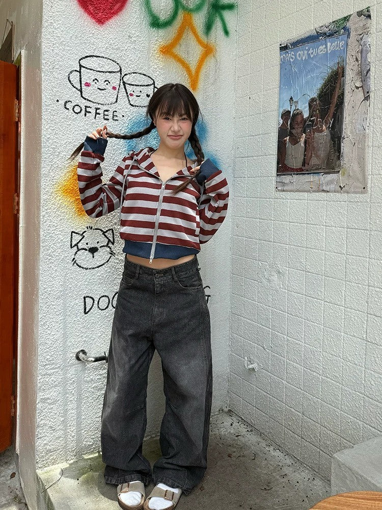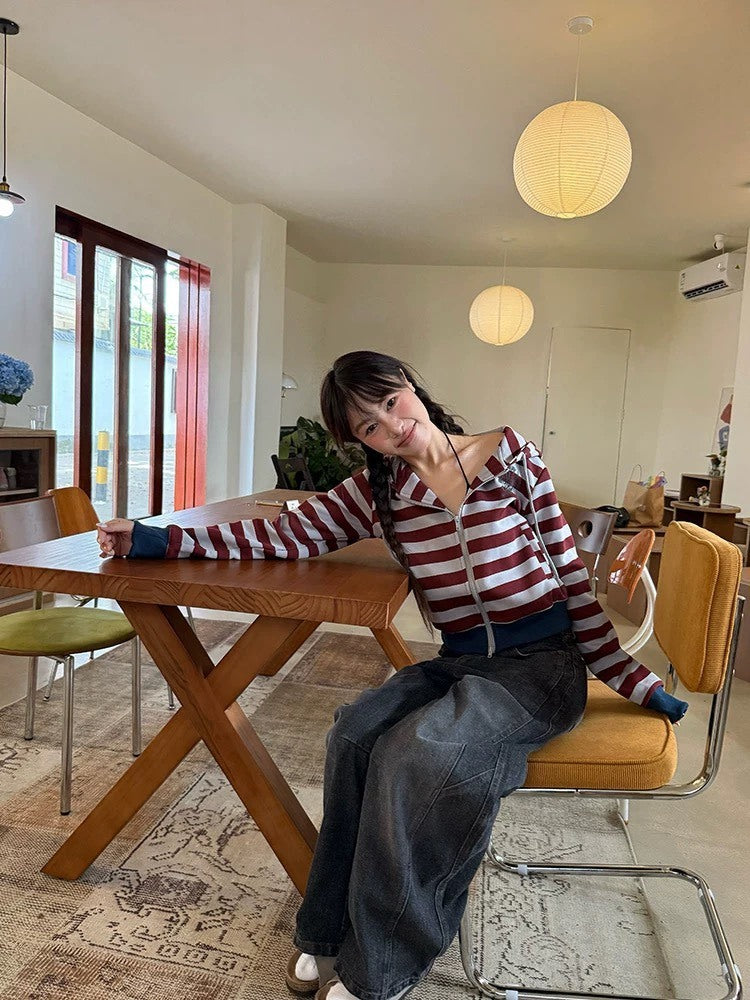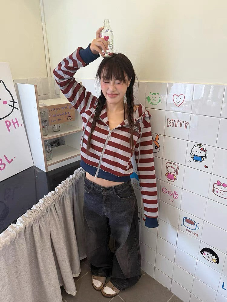 美式 復古 拼色 條紋 連帽 短版 外套