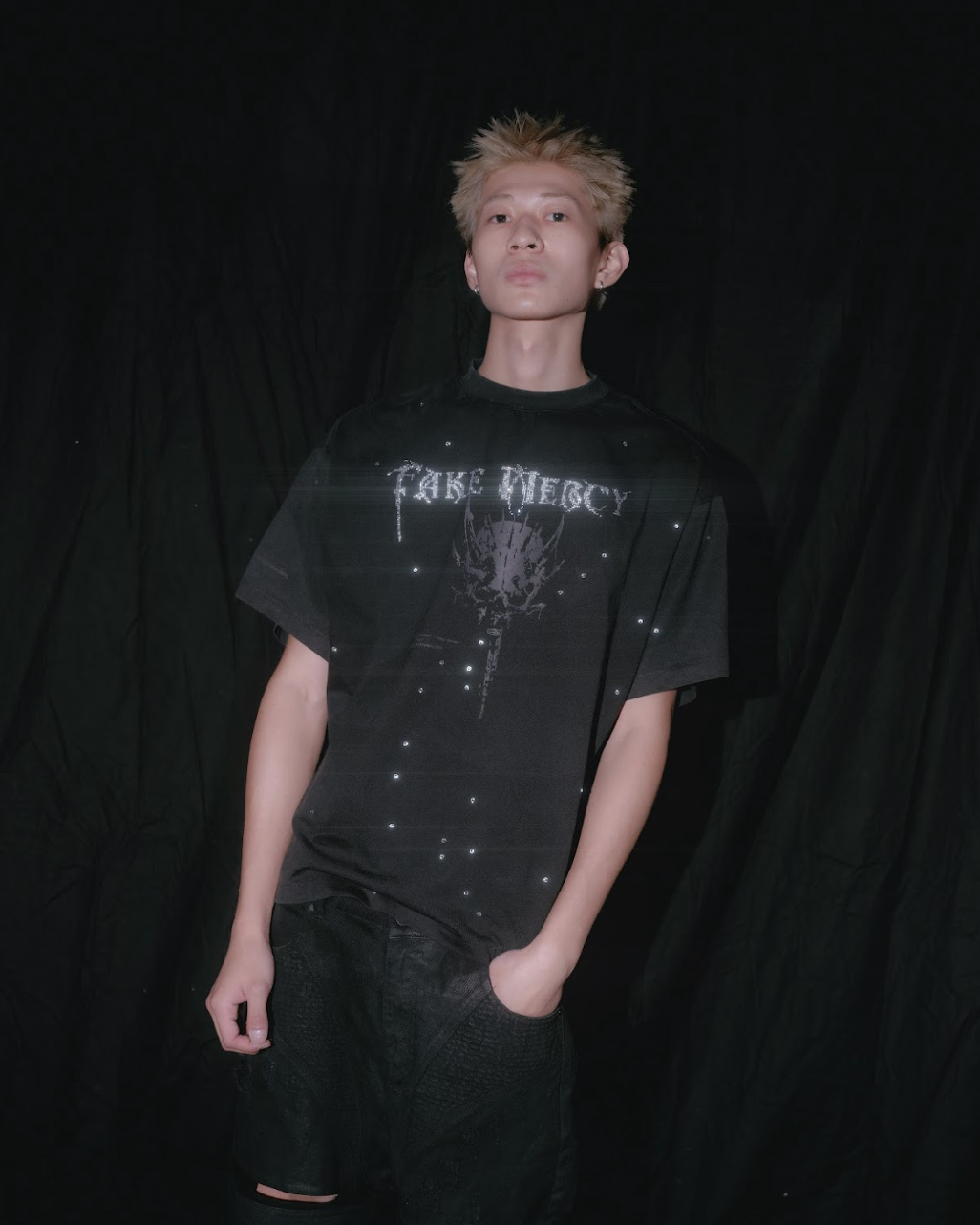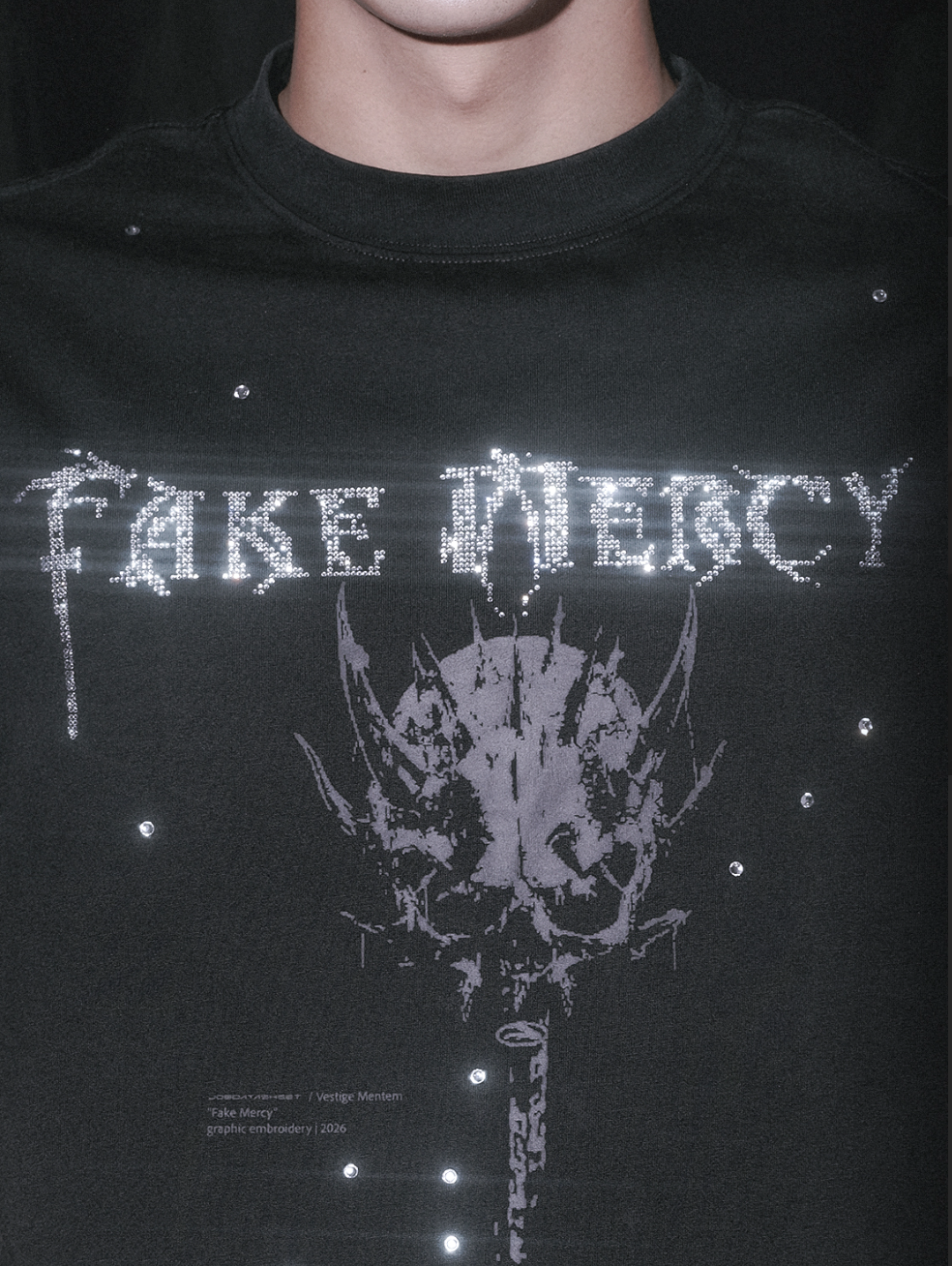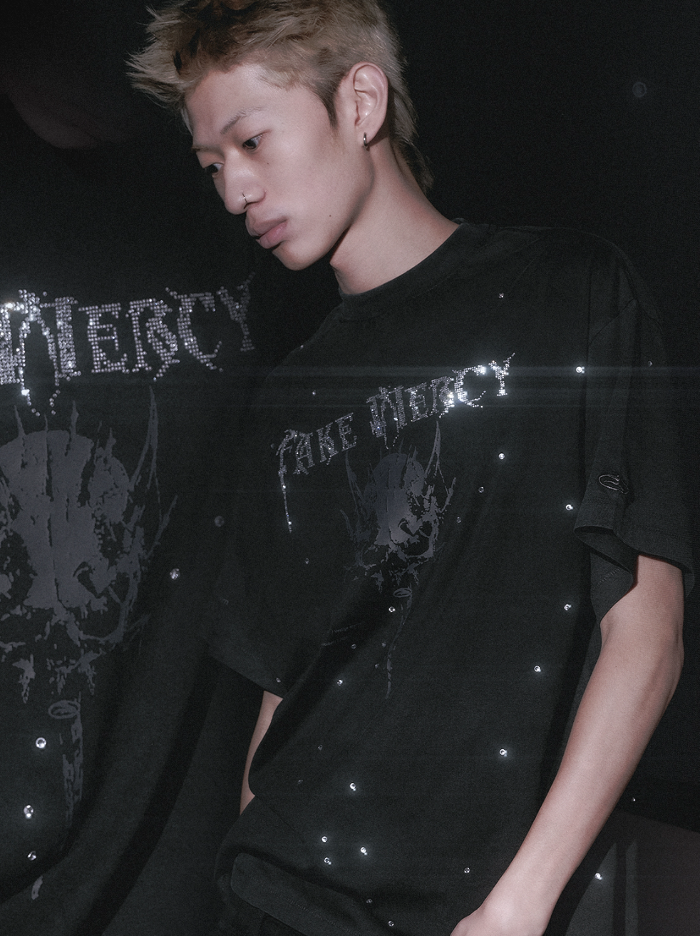 - Irregular rhinestone “Fake Mercy” lettering design on the front