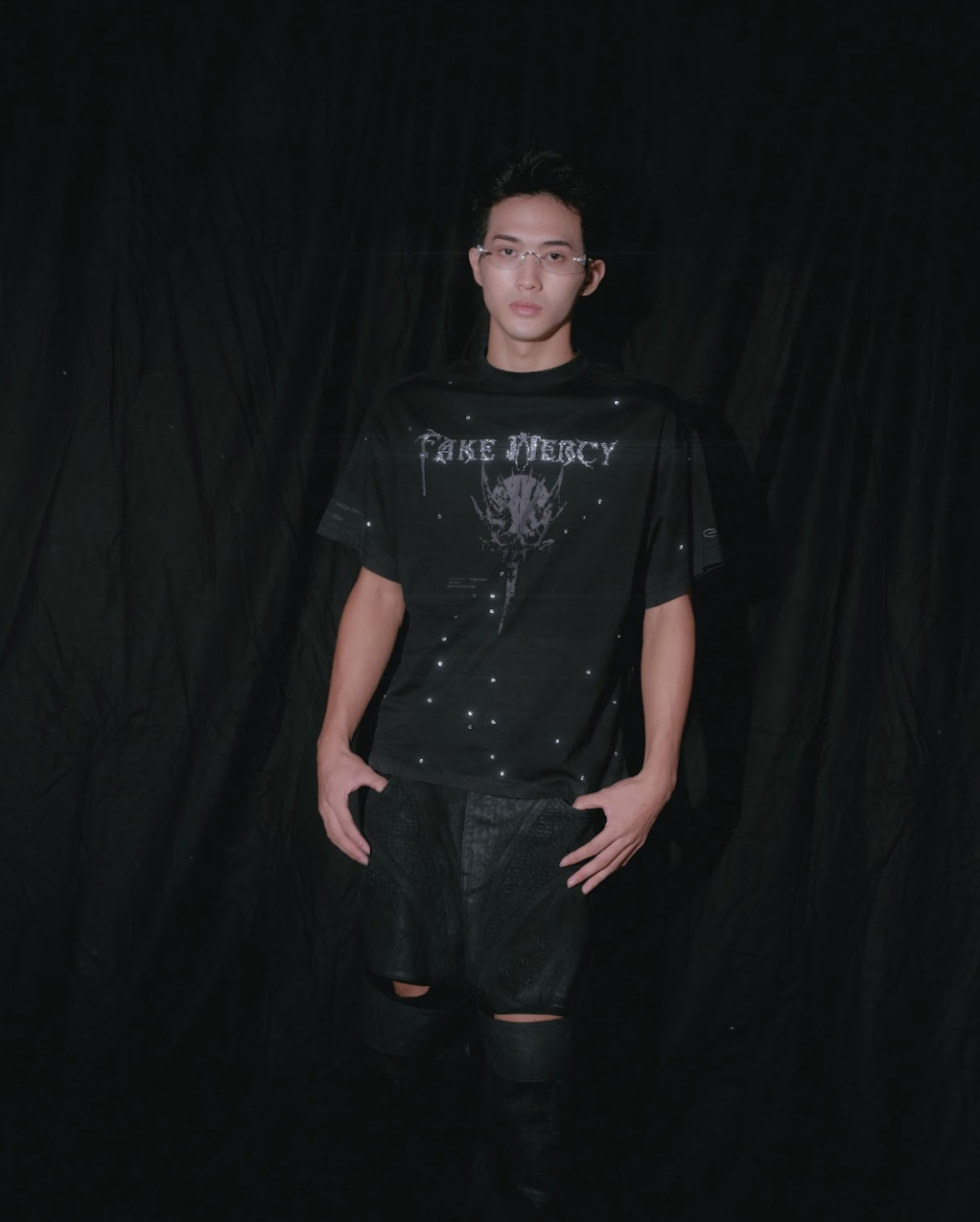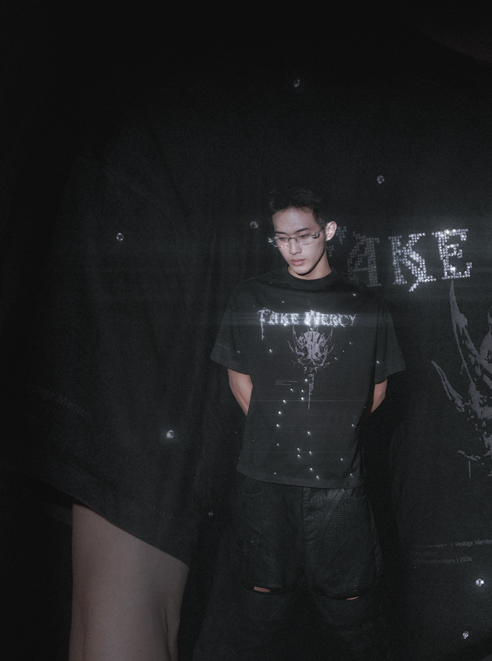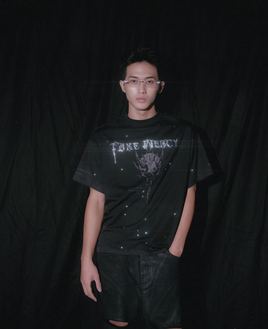 - Irregular rhinestone “Fake Mercy” lettering design on the front