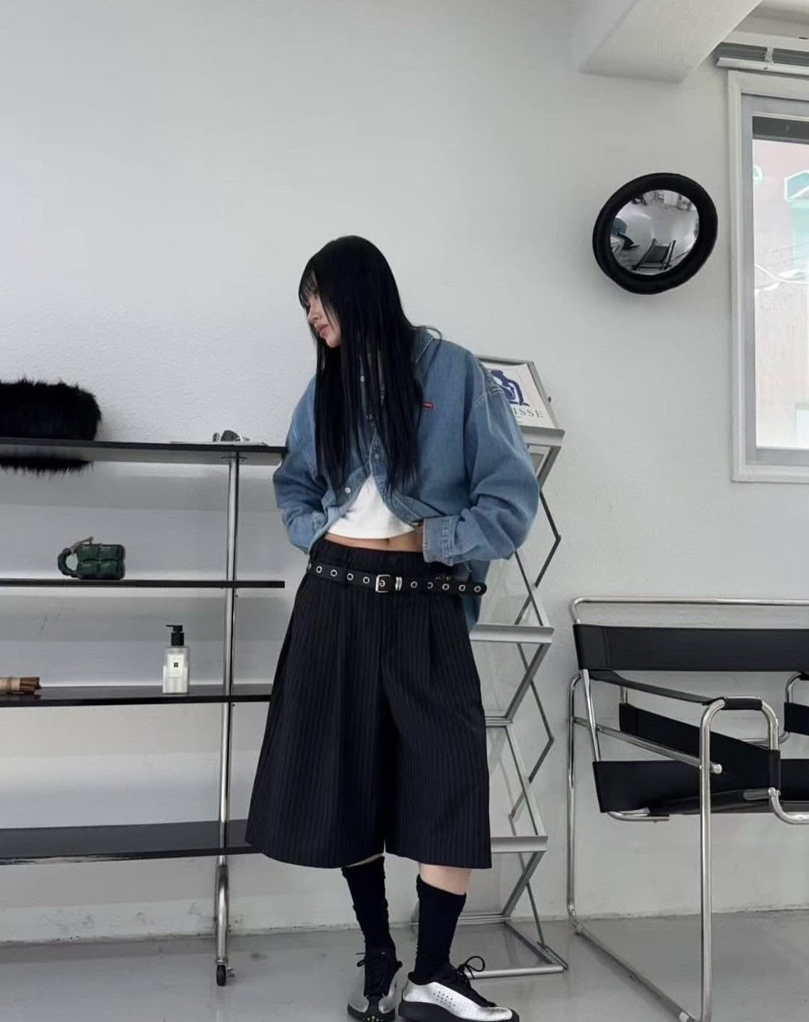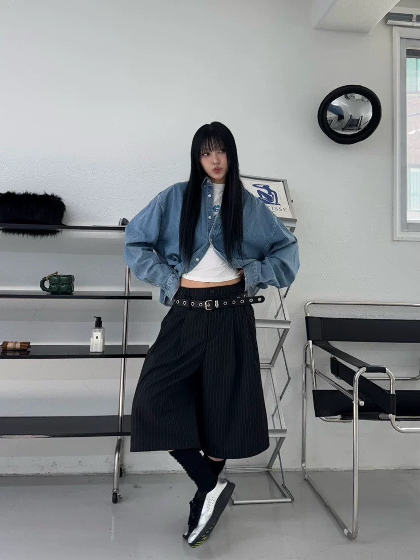 韓國 直條紋 腰帶 半鬆緊 寬鬆 西裝 短褲