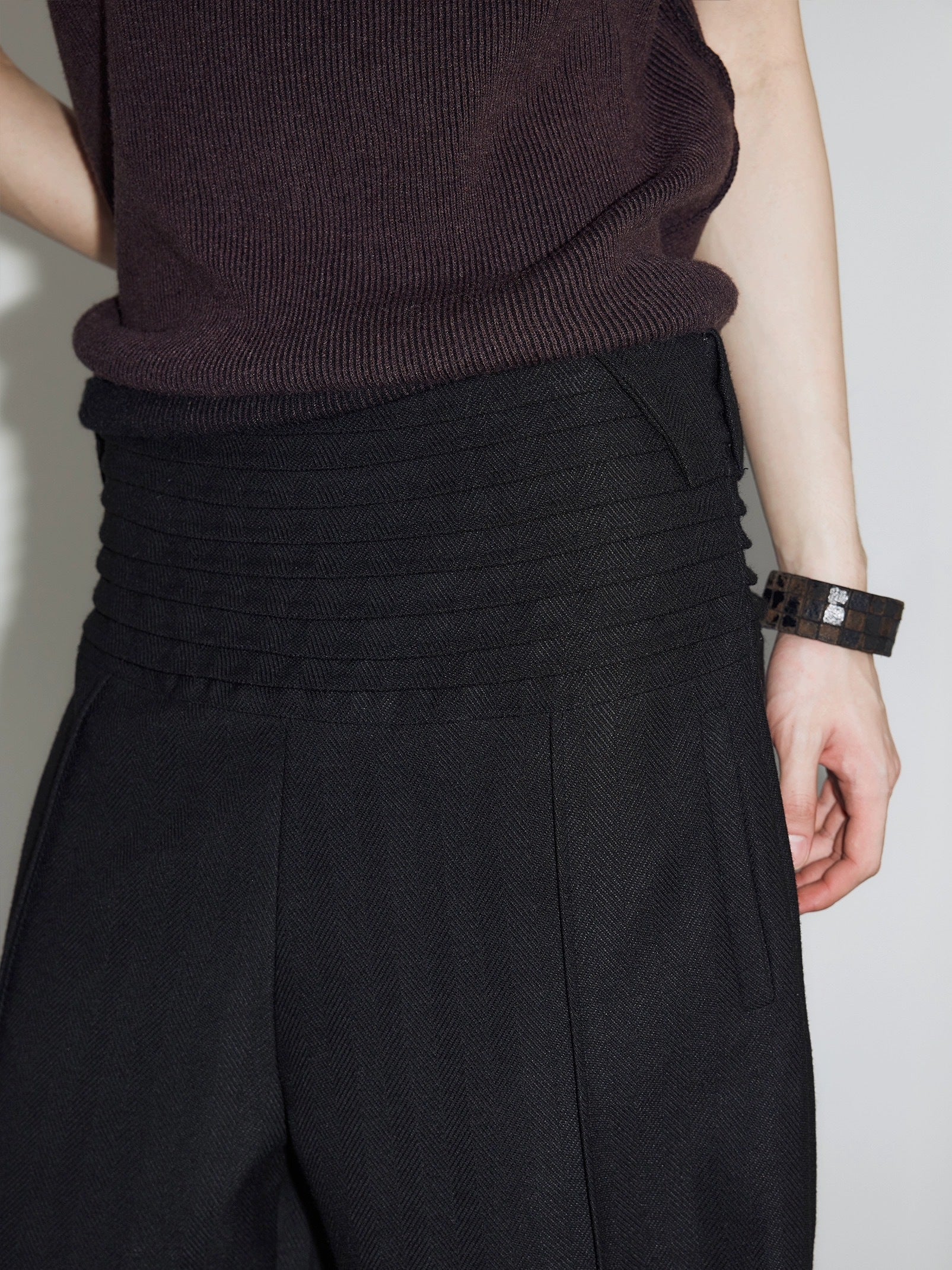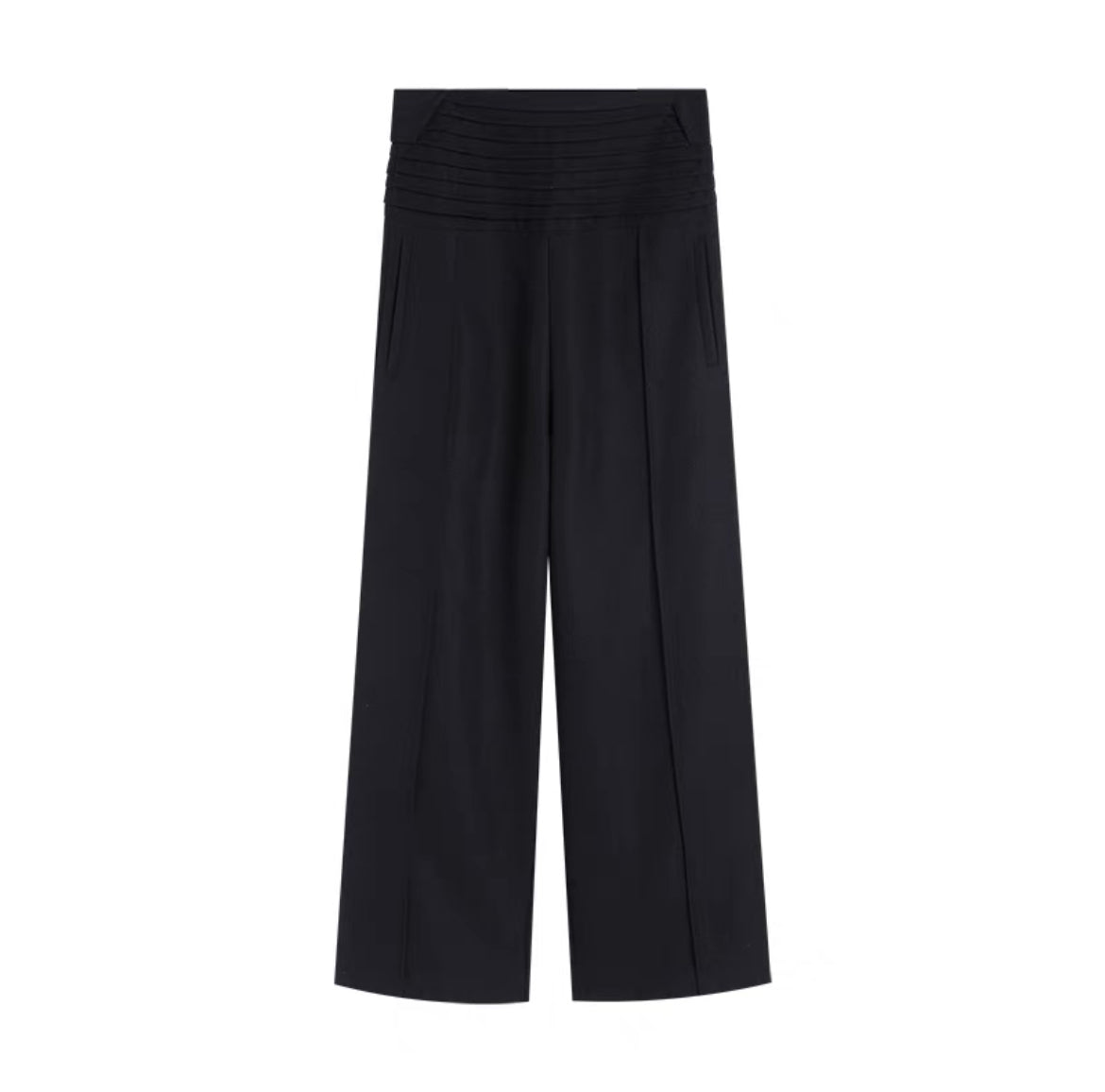 西褲運用了寬腰頭設計,腰頭的階梯收褶賦予西褲更立體的質感,使其看起來更加有層次感;版型寬鬆大氣,增加了日常穿著的舒適度和休閒感。