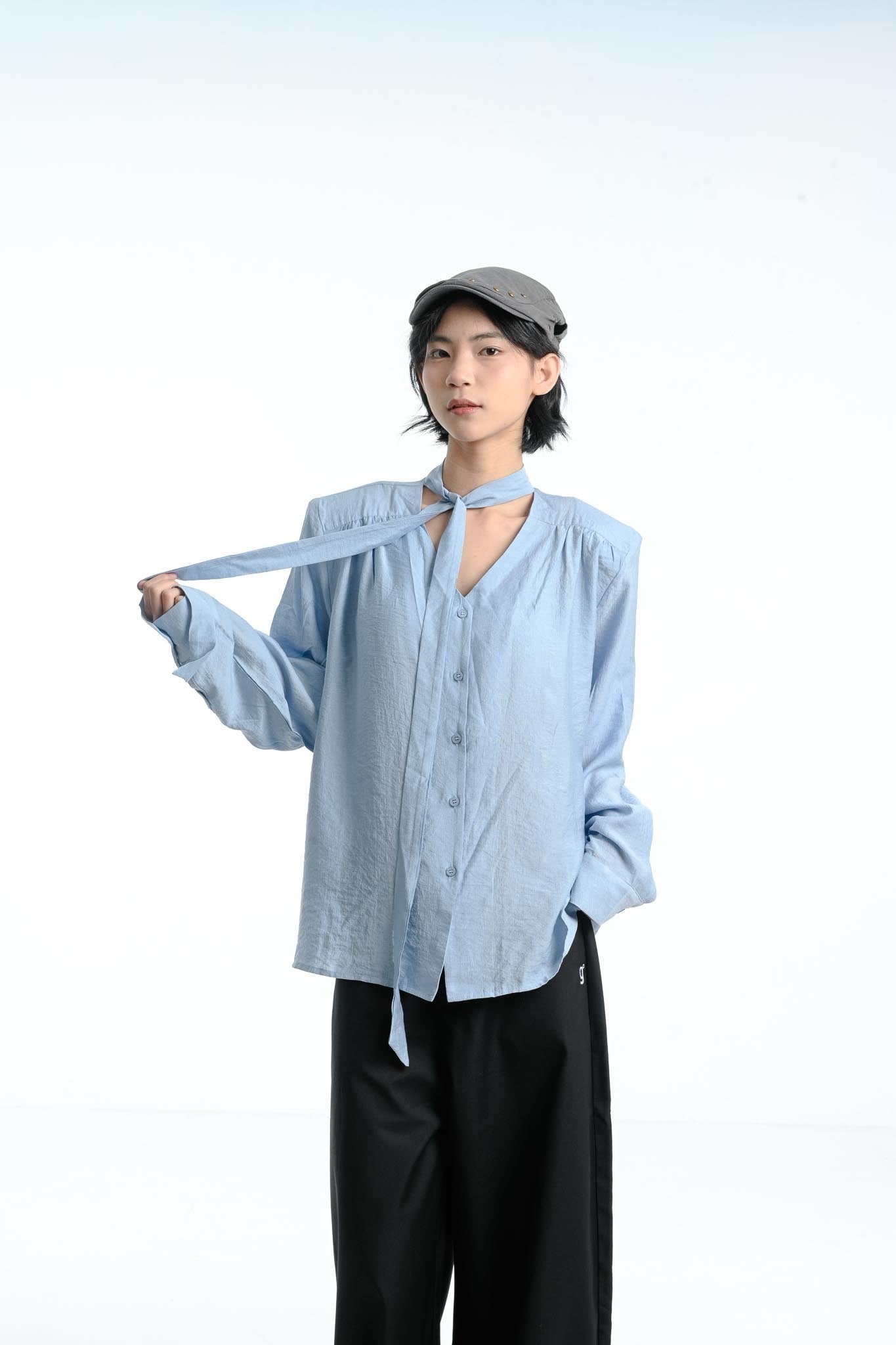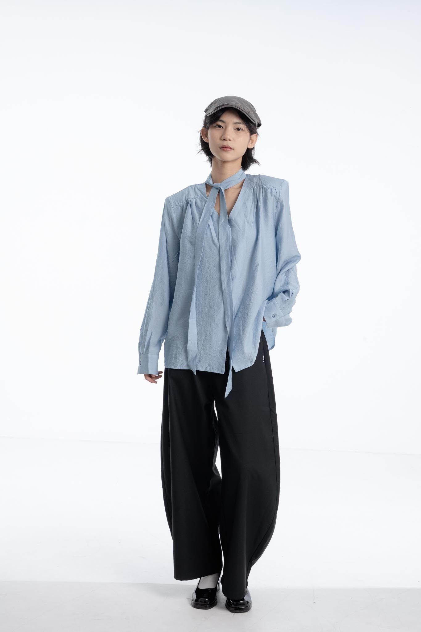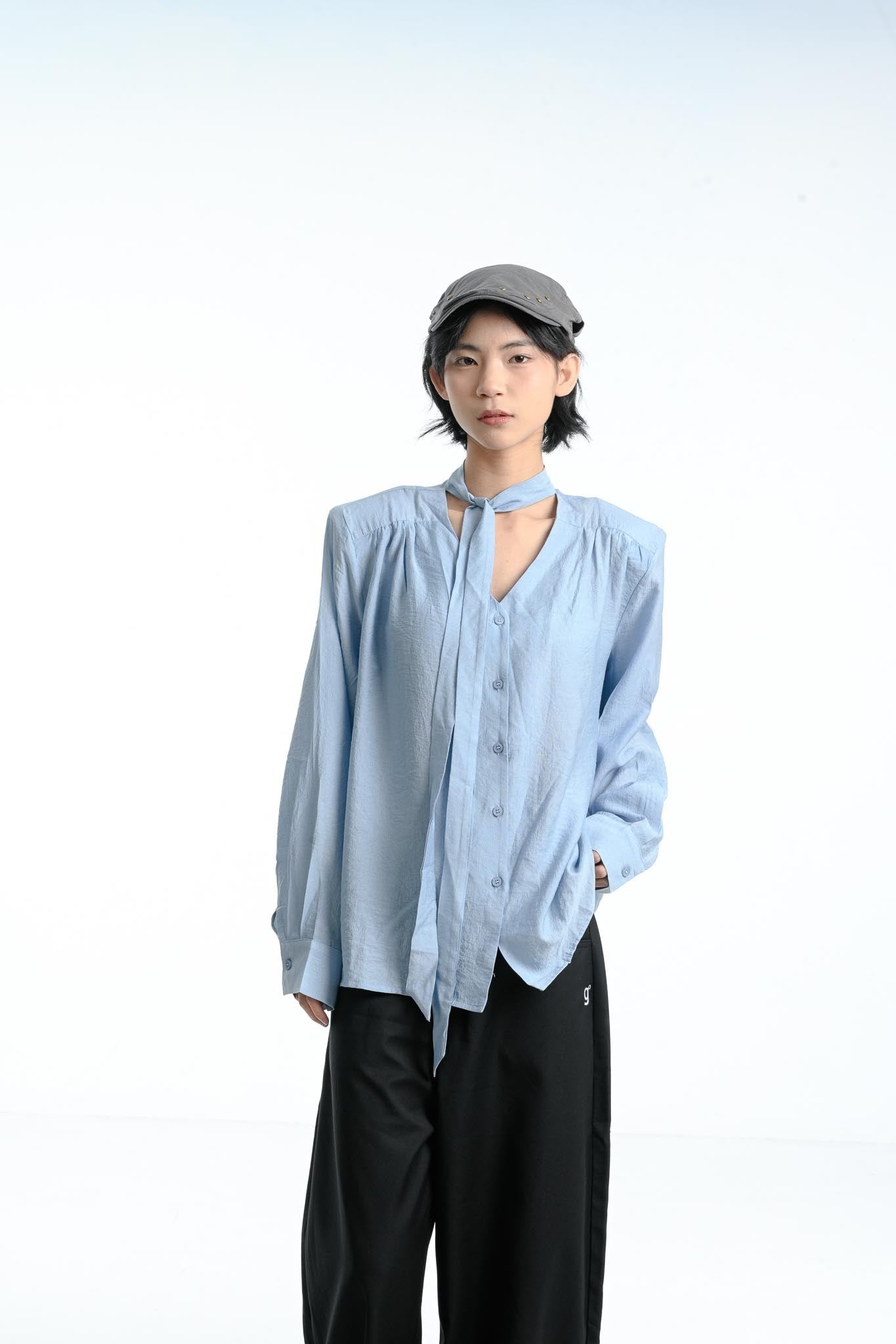 【GUBAN】簡約 通勤 飄帶 墊肩 薄紗 高級 長袖襯衫