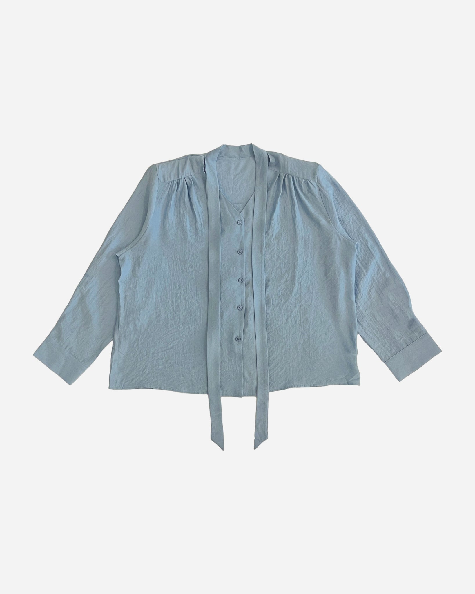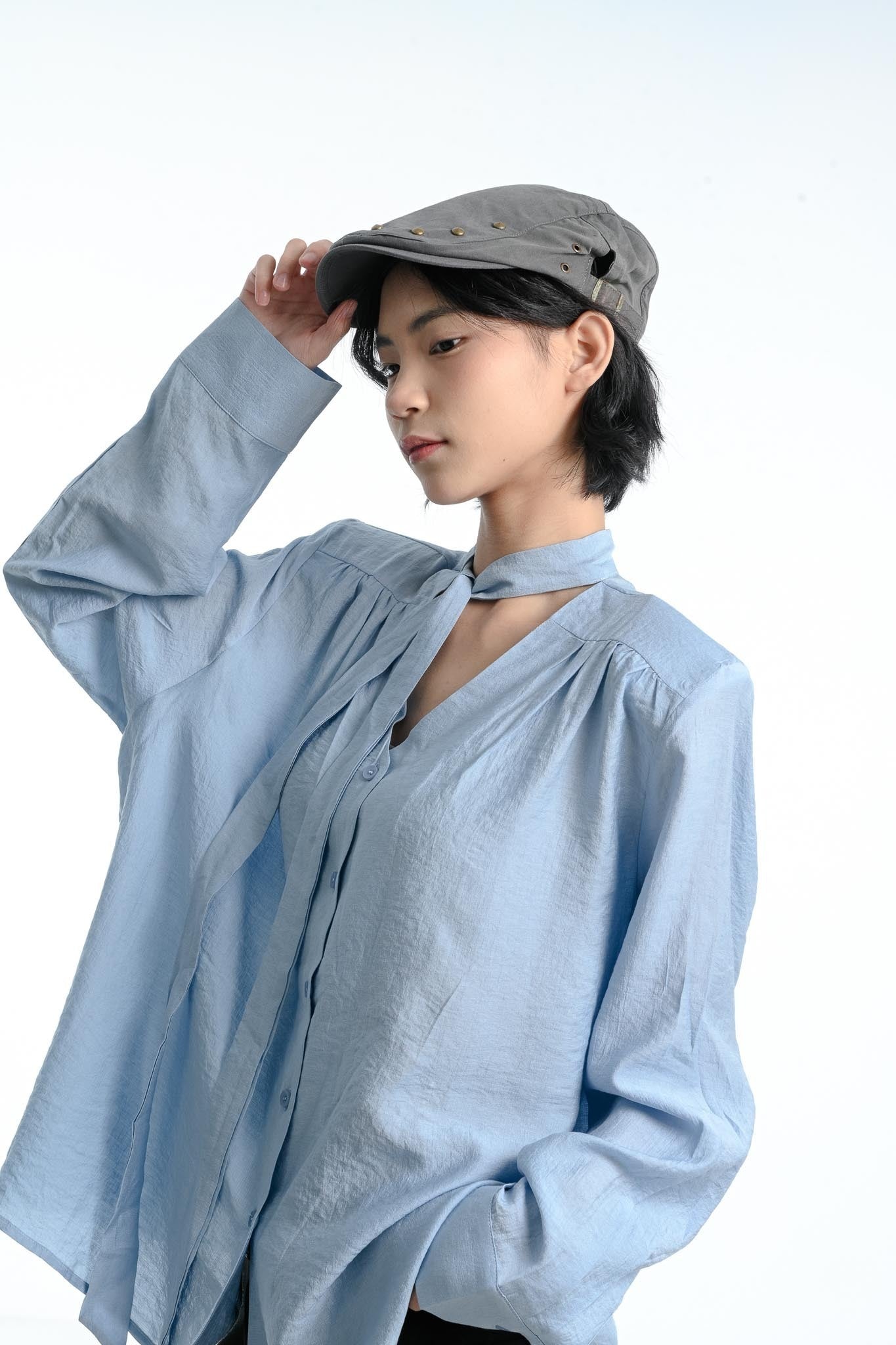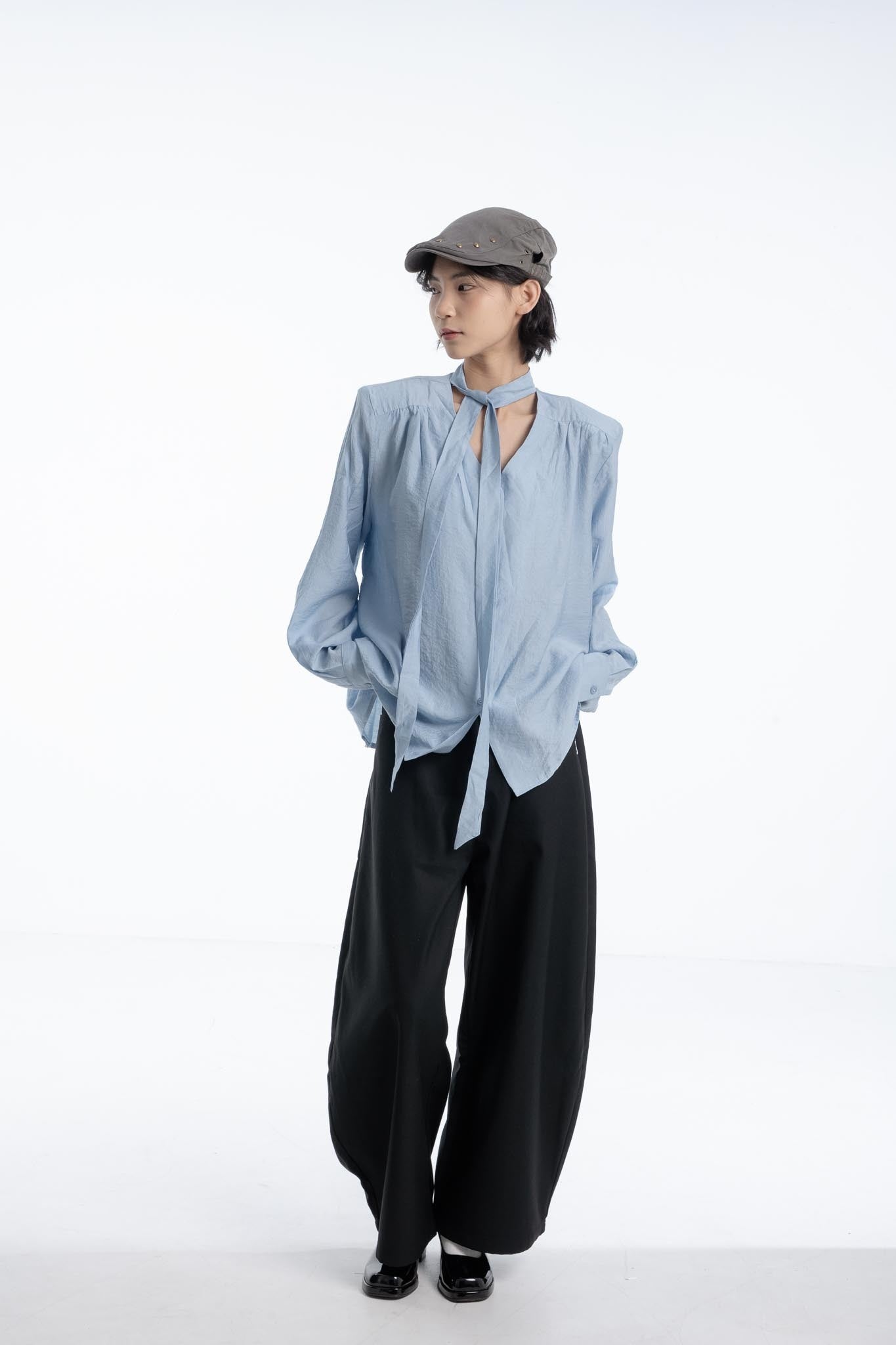【GUBAN】簡約 通勤 飄帶 墊肩 薄紗 高級 長袖襯衫