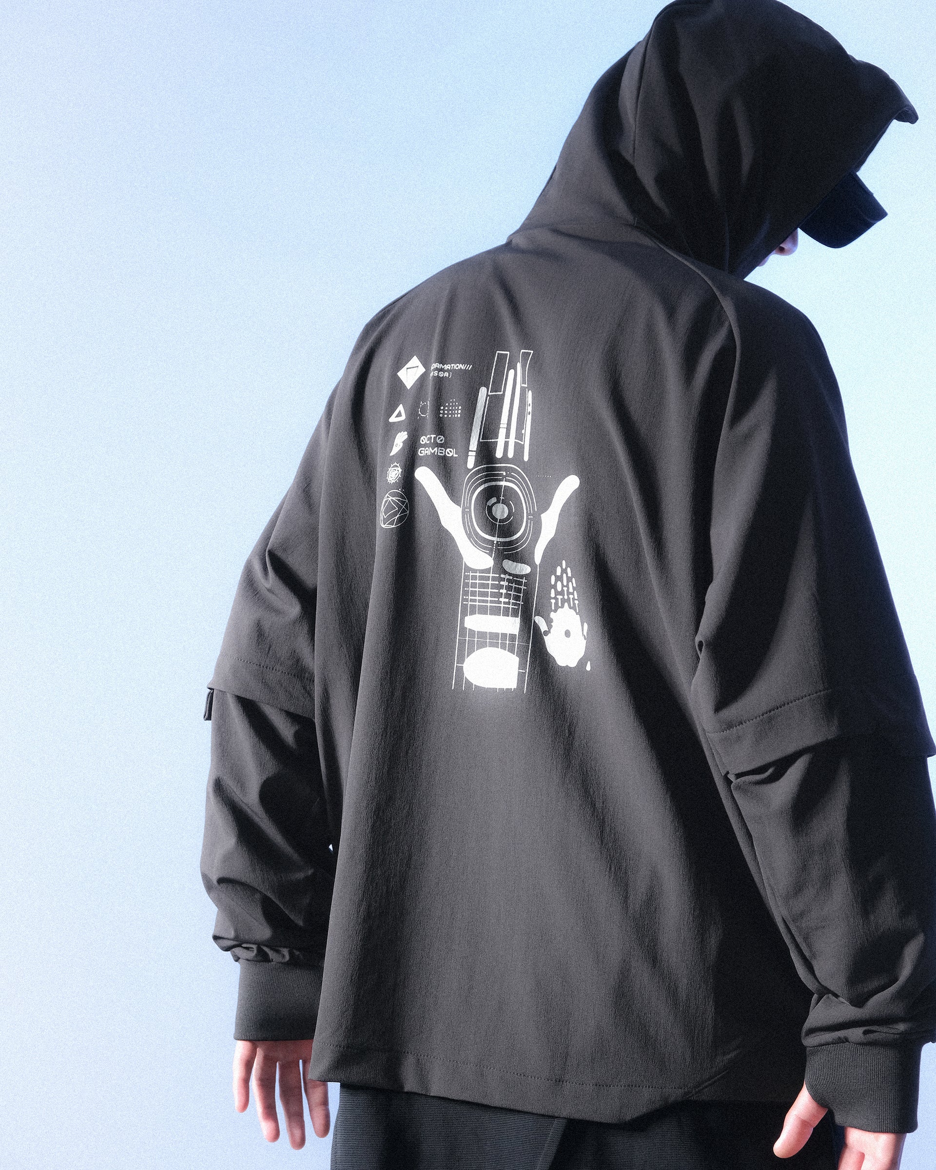 設計靈感以未來鎧甲作藍本,採用高彈力登山布料,配合立體層次及幾何線條呈現鎧甲的線條,並加入圖像點綴,帶來與未來的衝擊與結合。