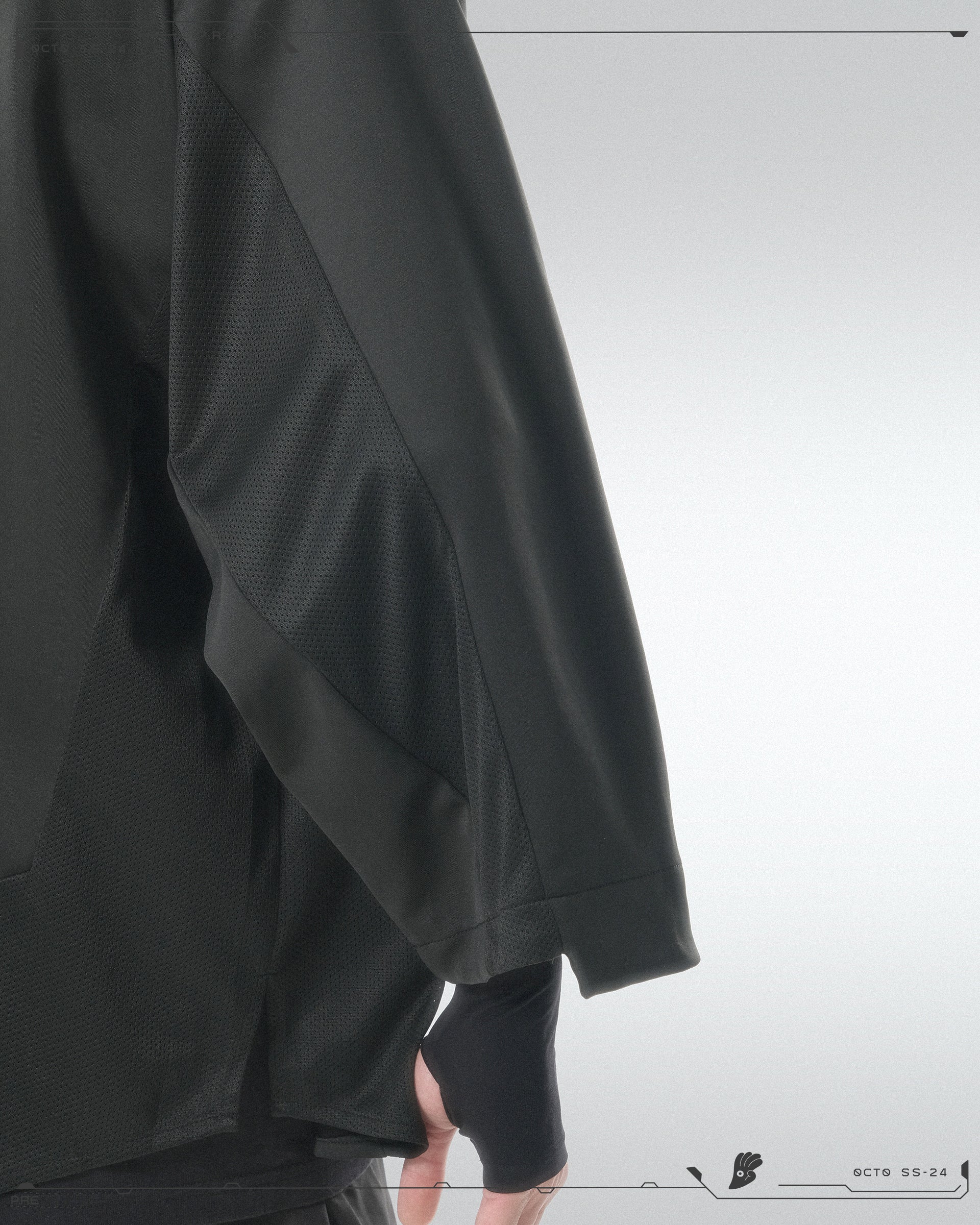 > Trapezoidal breathable patchwork is used on the left and right sides and behind the sleeves to enhance wind conductivity and reduce the discomfort caused by stuffy heat.