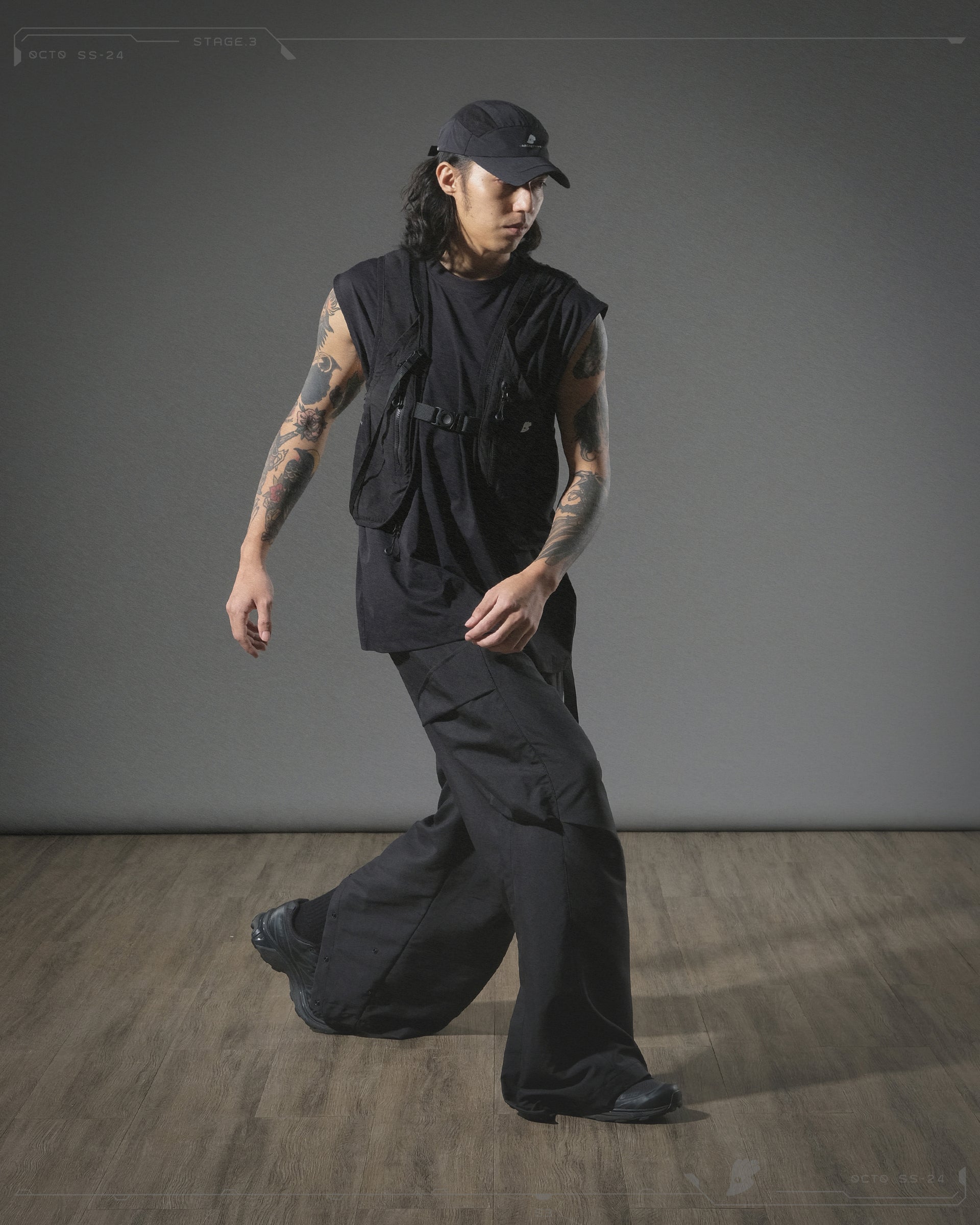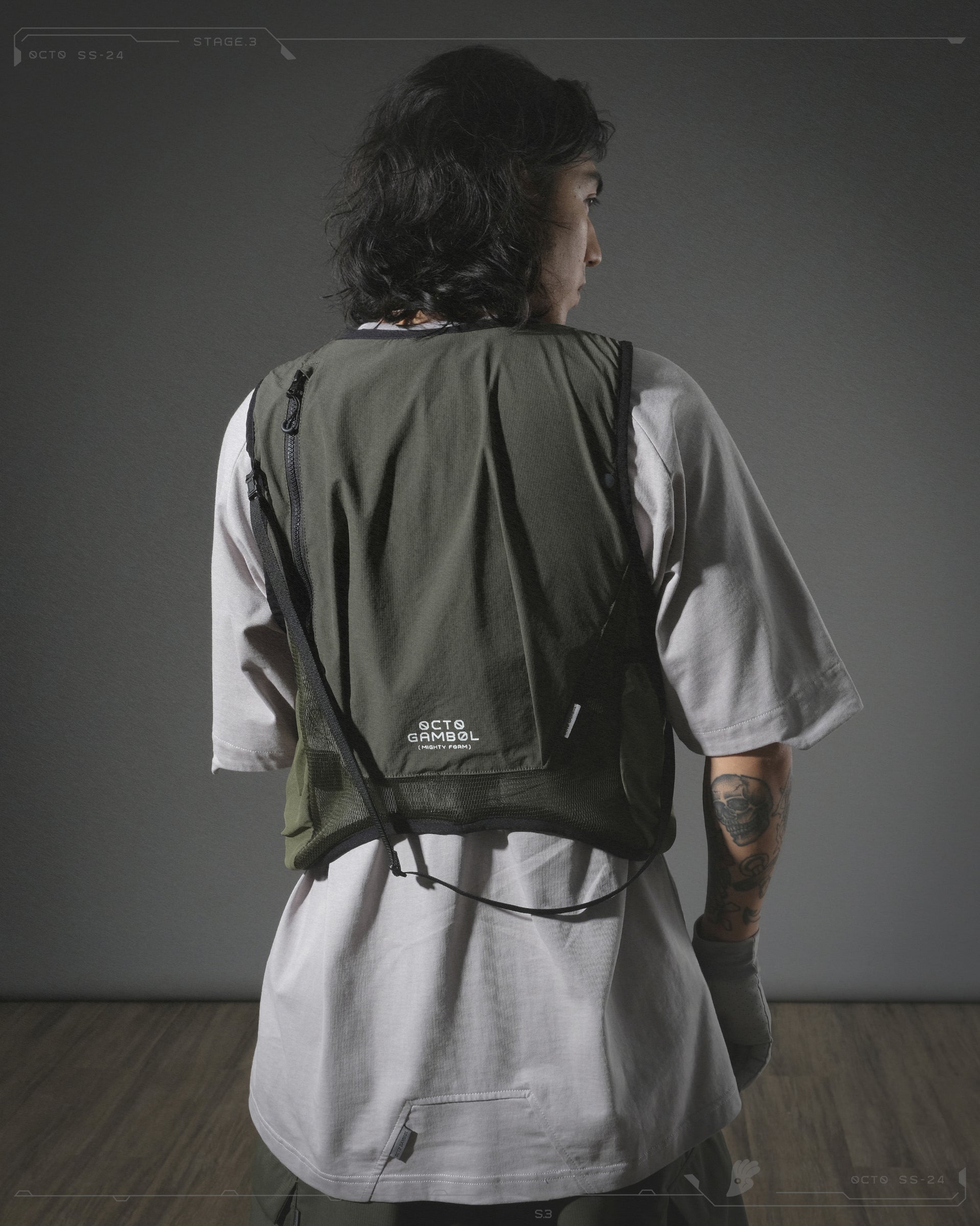 以變換形態為重點,利用可摺合式設計呈現背心的雙重形態,同時以外搭及斜背包兩種不同形態著用。