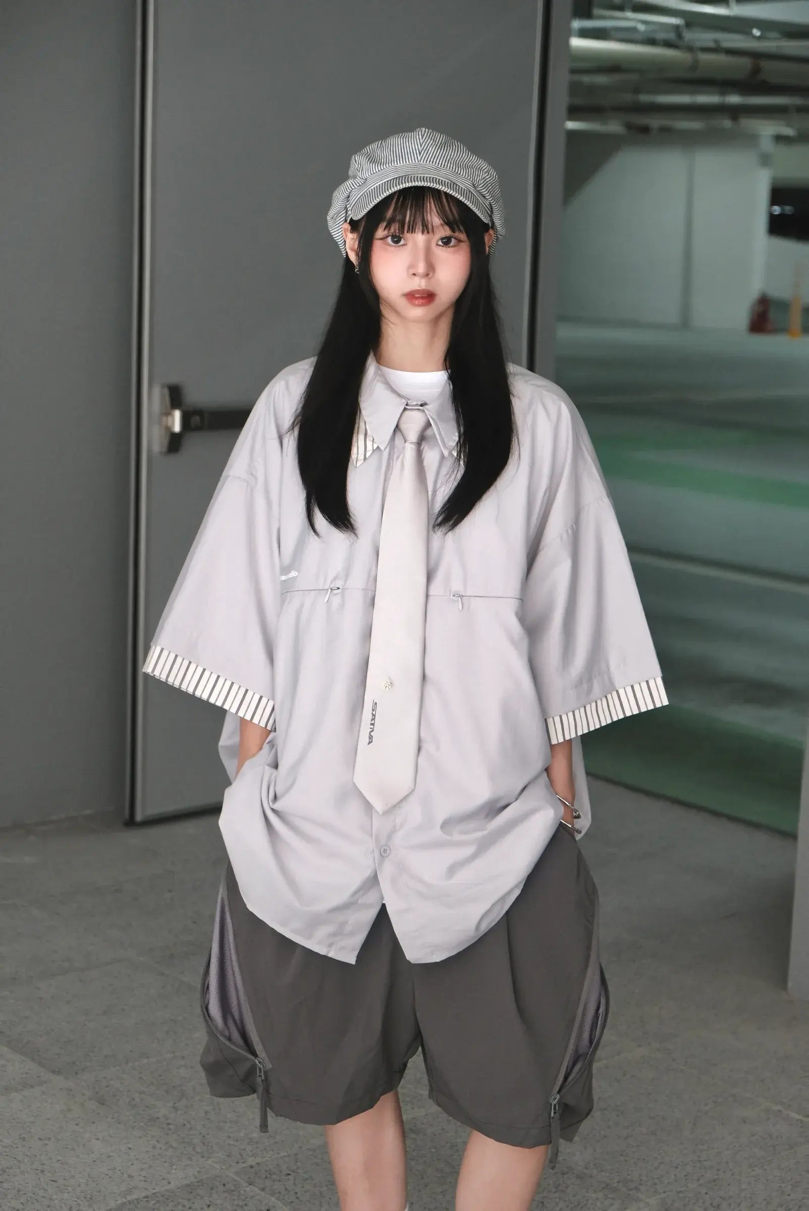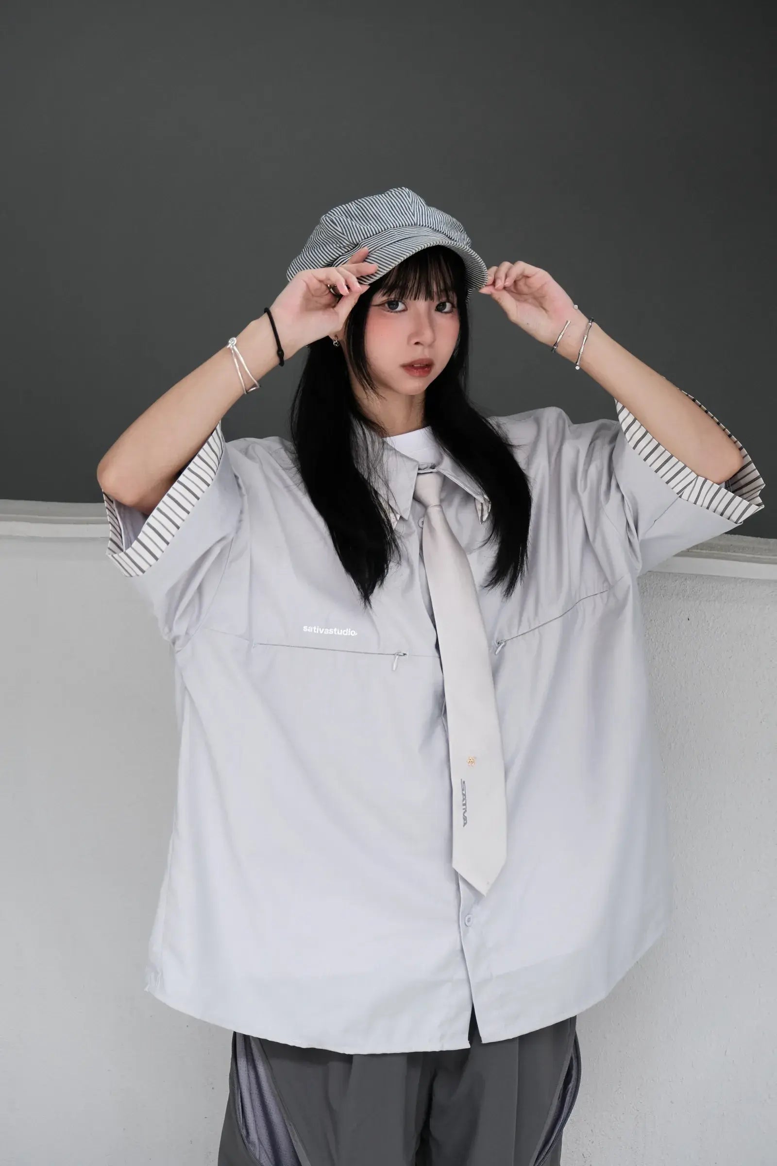 本次作品採100% Polyster面料,材質耐久抗皺,設計主體採調節式拉鍊設計,與 “H.BK-03”相輔相成;以配件初始的劍型領帶設計,極簡俐落的還原穿搭邏輯,並用領身配置品牌Pattern以及前後品牌LOGO點綴,提供全新穿搭組合與儀式迴路。