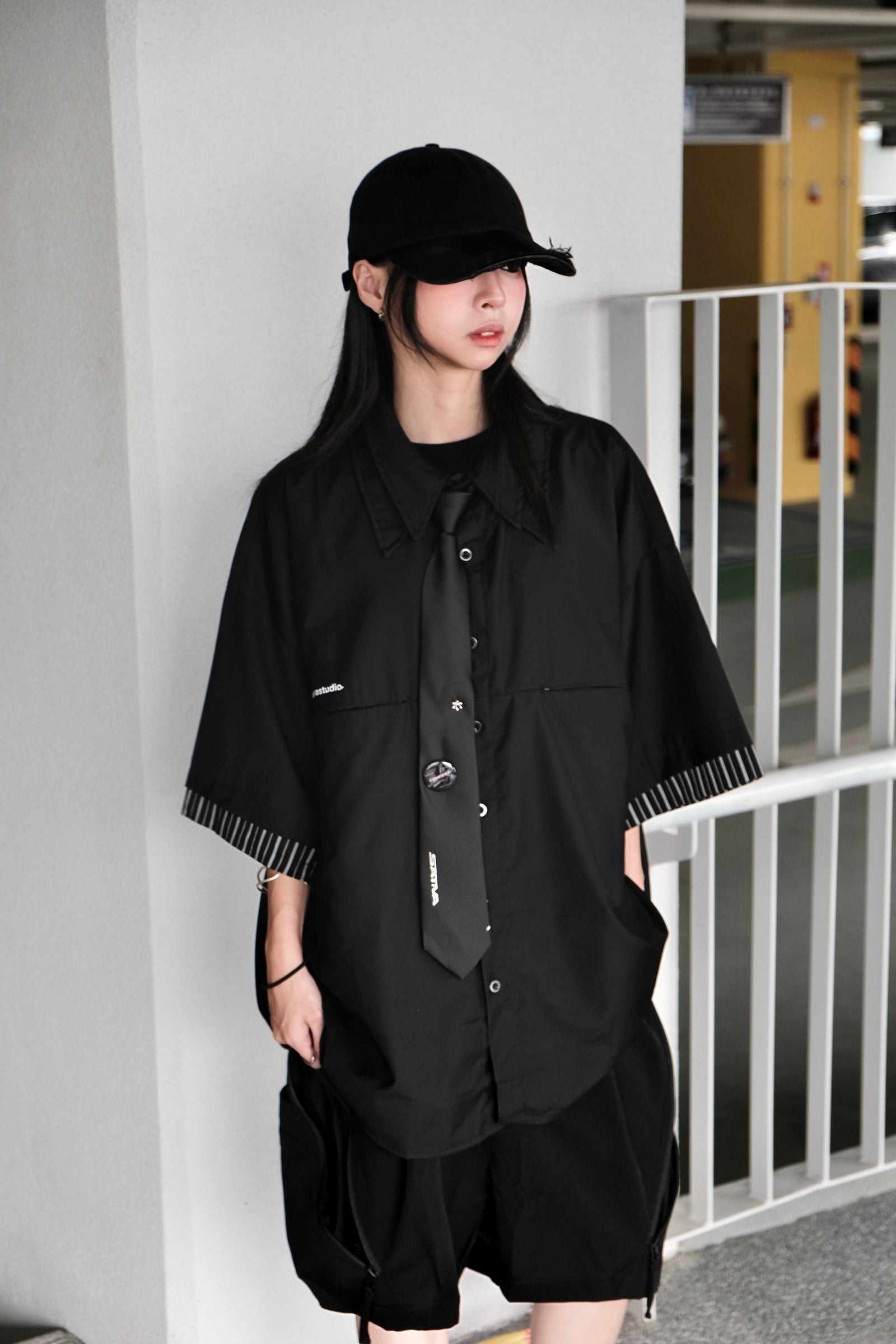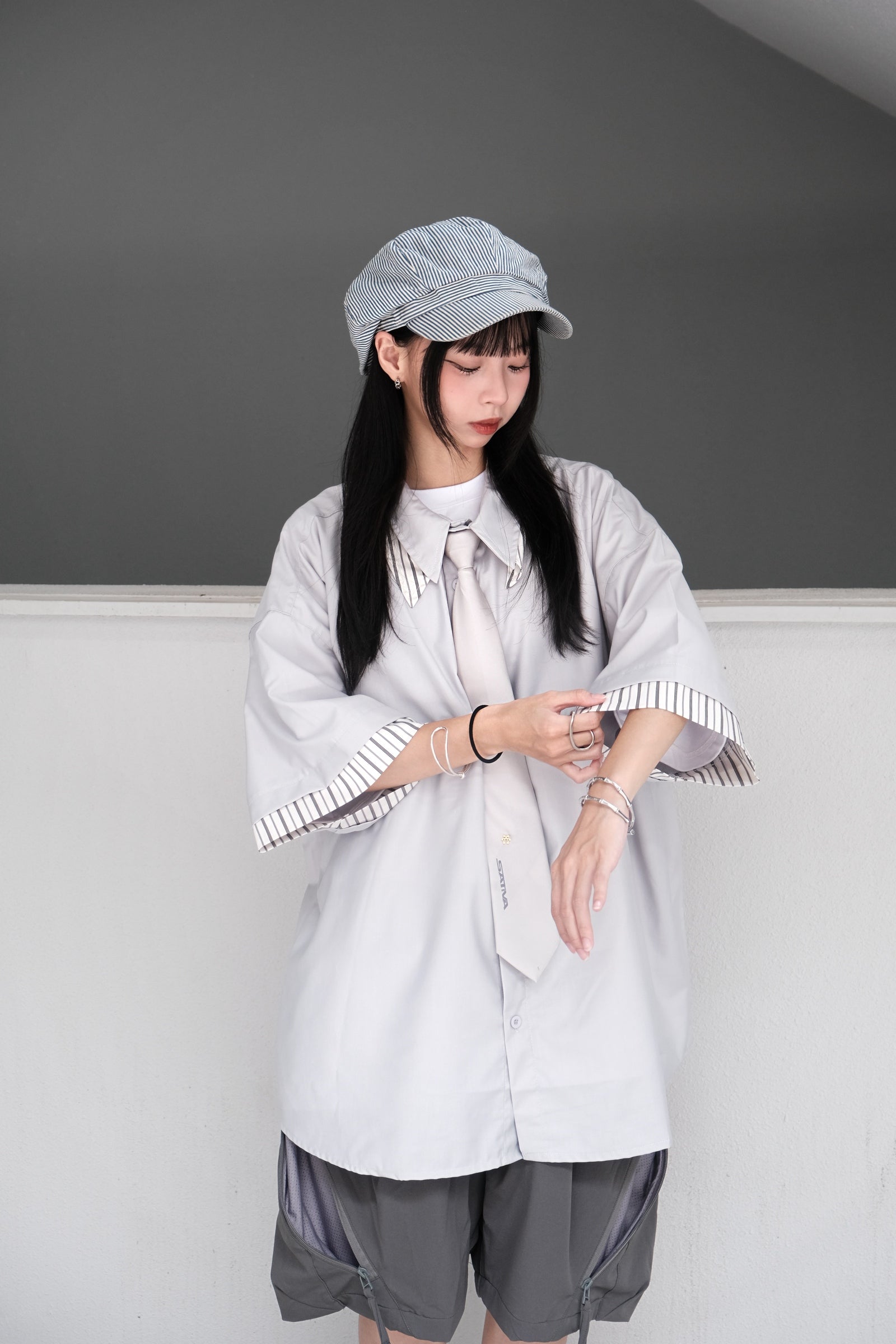 本次作品採70% Nylon與30% Cotton混紡面料,保有Nylon材質提供的輕薄強韌、耐磨抗皺的特質之外,賦予棉質衣料的舒適透氣、柔軟親膚的優點,亦能將「重組」概念貫徹執行。衣體剪裁則在保有襯衫輪廓的同時,設計為「雙領設計」與袖口疊加設計,並運用H.BK-03的設計邏輯,將純色的面料加上條紋設計,創造視覺上的和諧與律動,搭配 “E-01” Symbolic Tie的自由調配,讓著用者可視情境與場域自由流動,休閒之餘亦能保有穿搭層次。