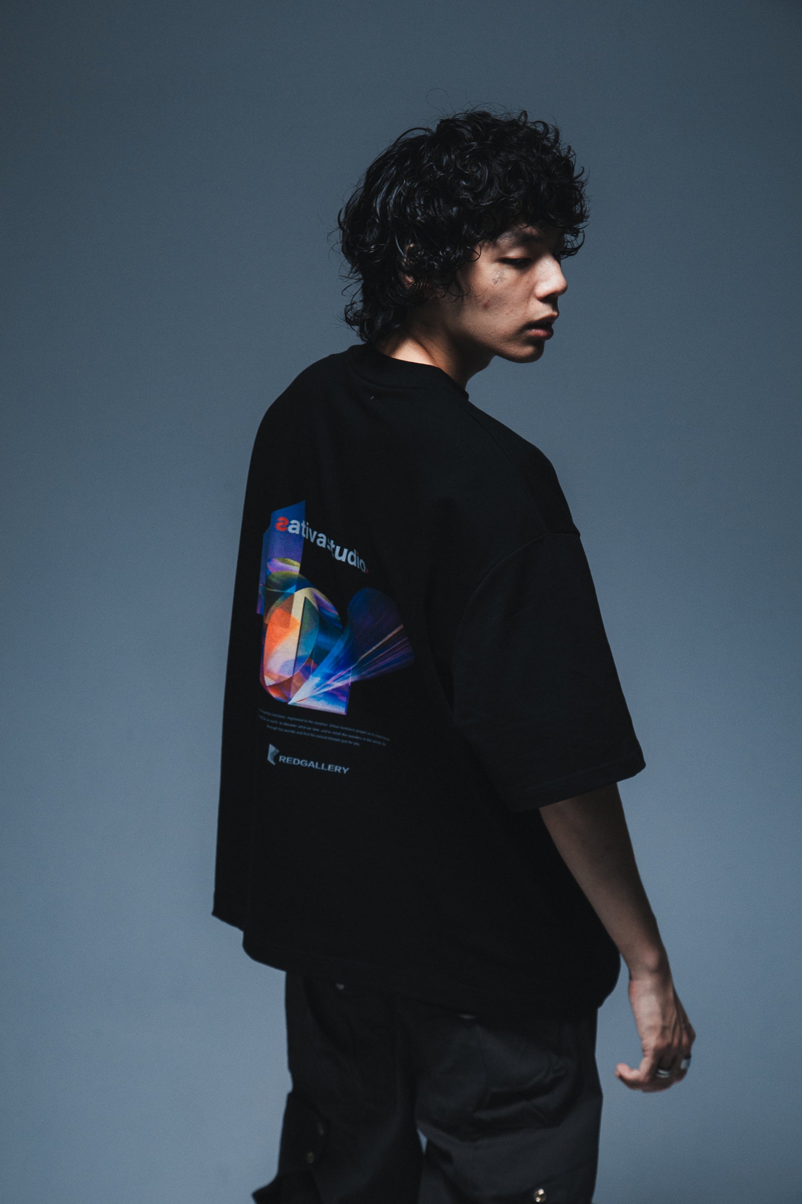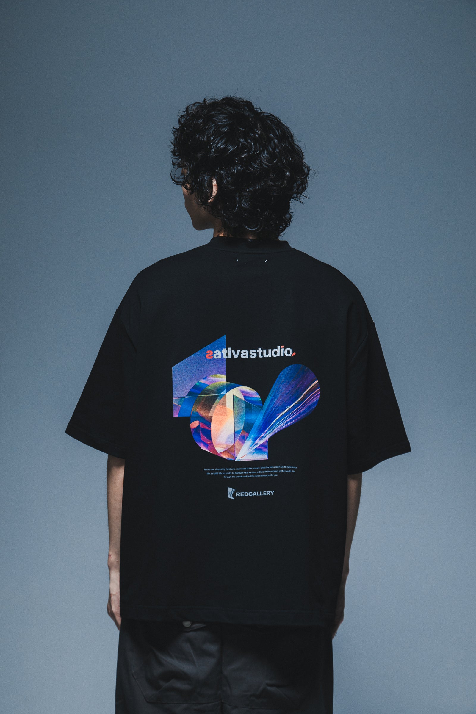 本次作品採用95% Cotton與5% SP彈性纖維,面料涵括以往100% Cotton所給予的純棉厚實感與透氣性,並同時擁有彈性材質的穿著韌性與舒適感受;正面視覺以818 GA展示系列首作展露一角的明示意涵,收錄成作並以此為基礎,往後作品皆以此概念延伸並不斷延伸至多個向度;後背主視覺則以數位疊影與高彩度光線預示著棱鏡折射的光線走向,以及透視錯覺的城市情境,並賦予SATIVASTUDIO的Tagline作為實驗情境中的操作化定義,從虛擬意識中跨逐至現實世界,模糊虛擬意識與日常生活之中的界線,由此佇足並伊始。