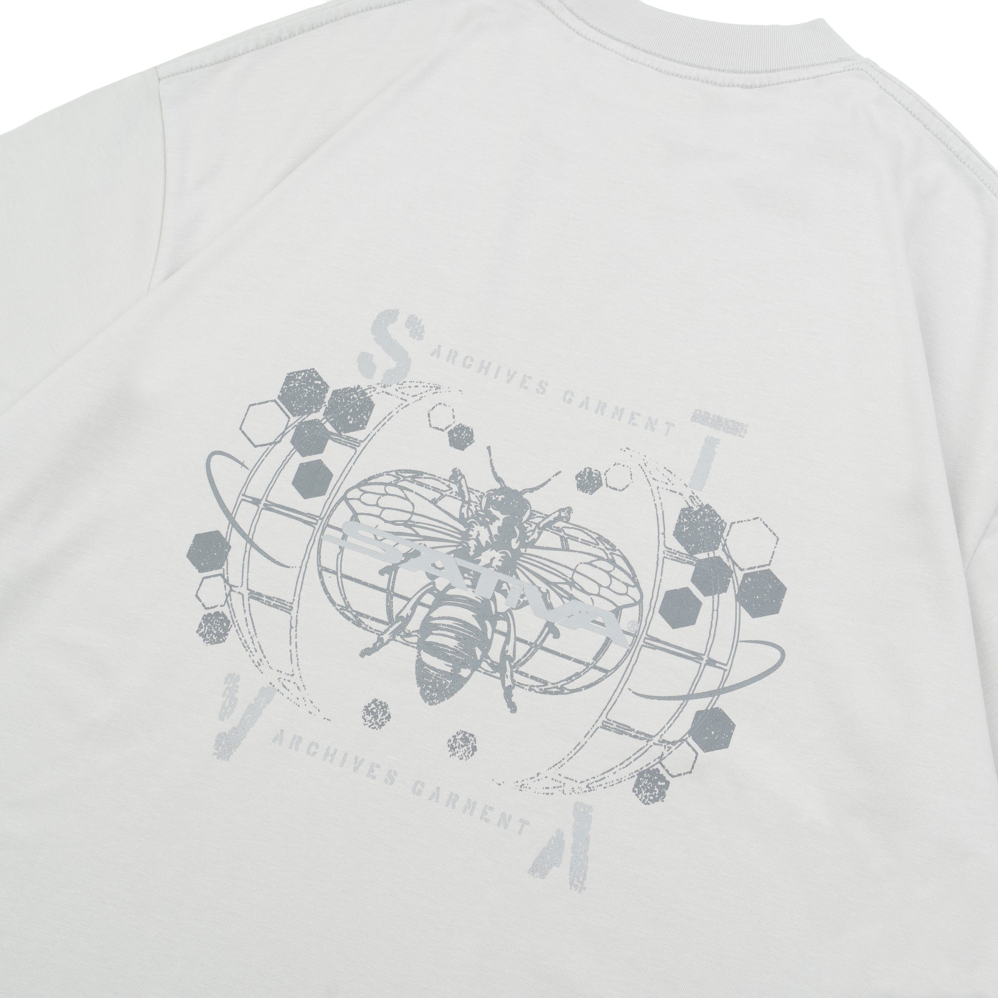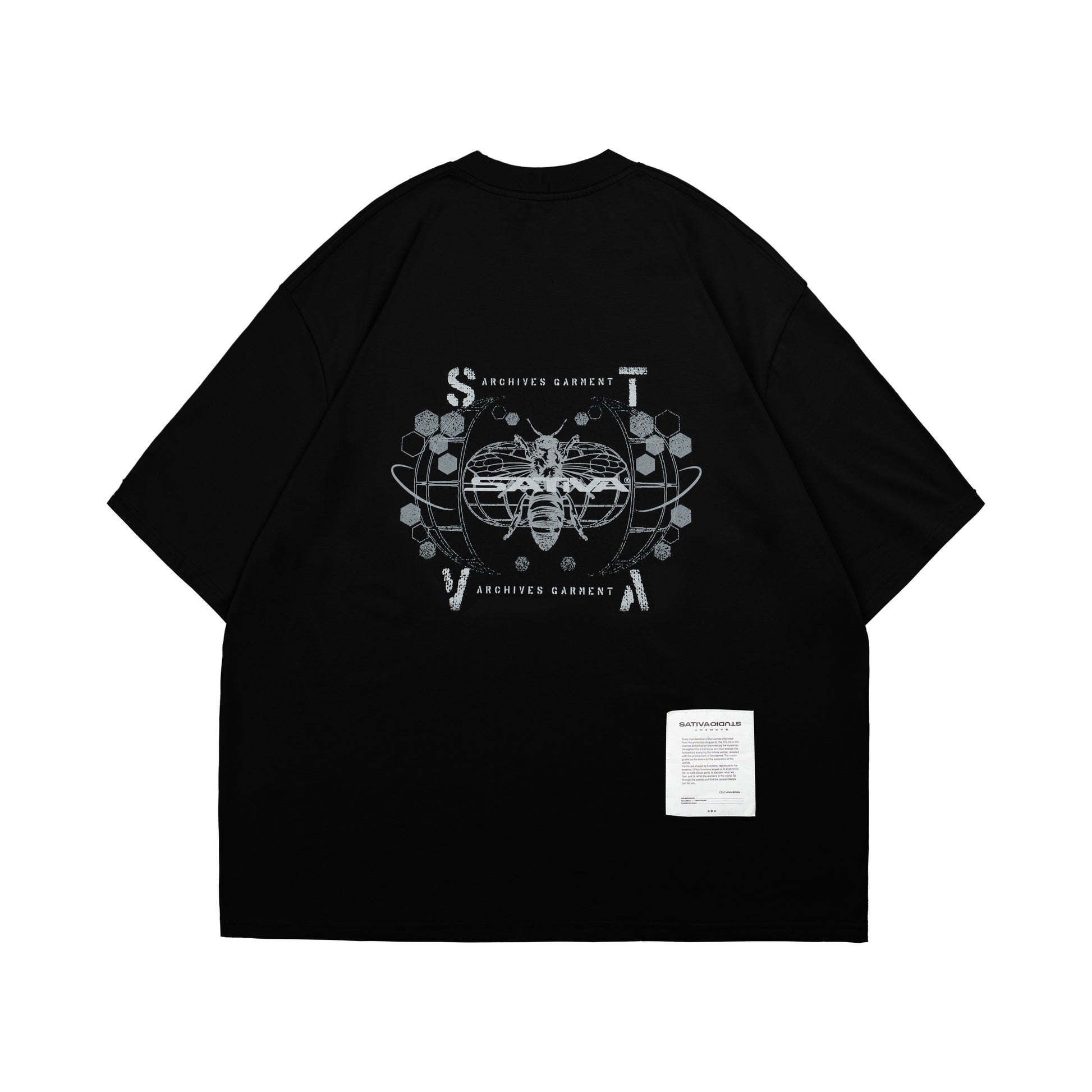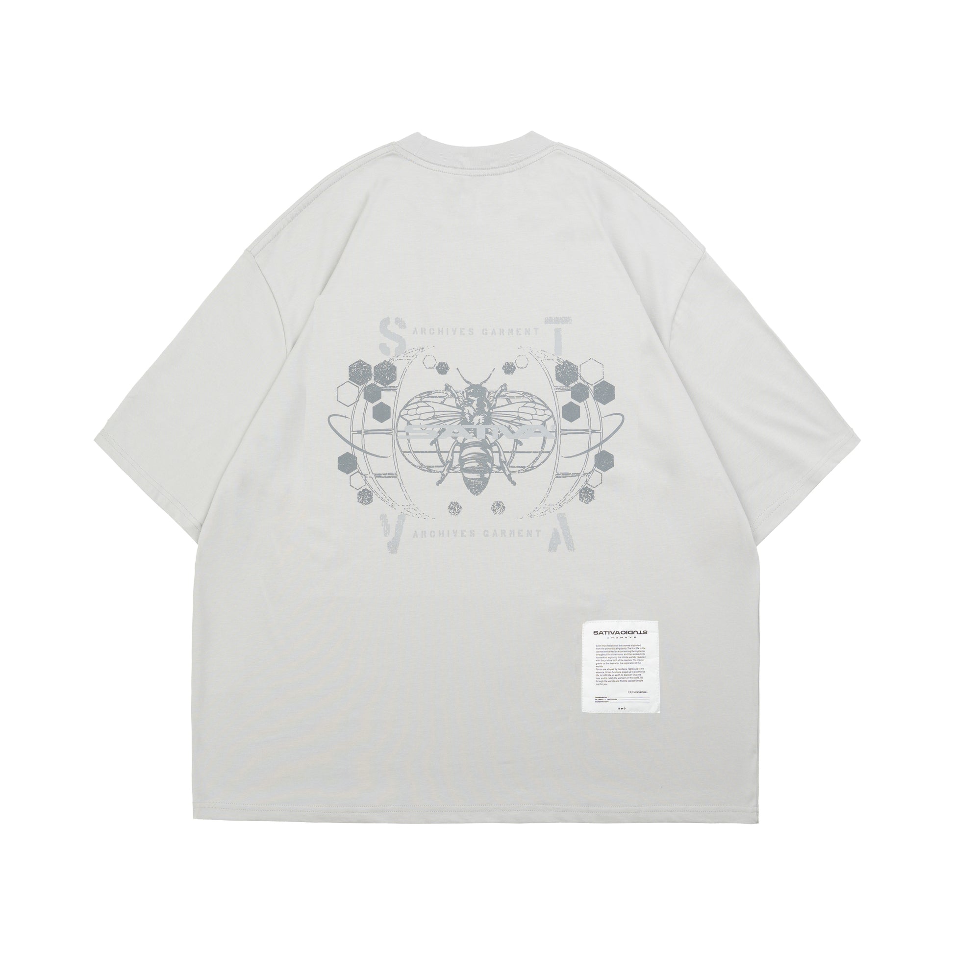 本次作品採100% Cotton舒適透氣面料,正如「蜜蜂效應」呈現的實驗情境一樣,棉質製品固然適用任何作品,但我們打破其過往製作邏輯,選擇以棉質為基礎,並在其中進行改作。正面視覺引用品牌一貫標語,後背視覺則為實驗後結果的呈現,貫徹該實驗的主體,我們以蜜蜂形象重塑實驗情境,並展示其振翅後所引發的連帶反應,亦即現有秩序的擾動,並以此作為重組既有印象的契機,以及帶有隨機性的智慧。