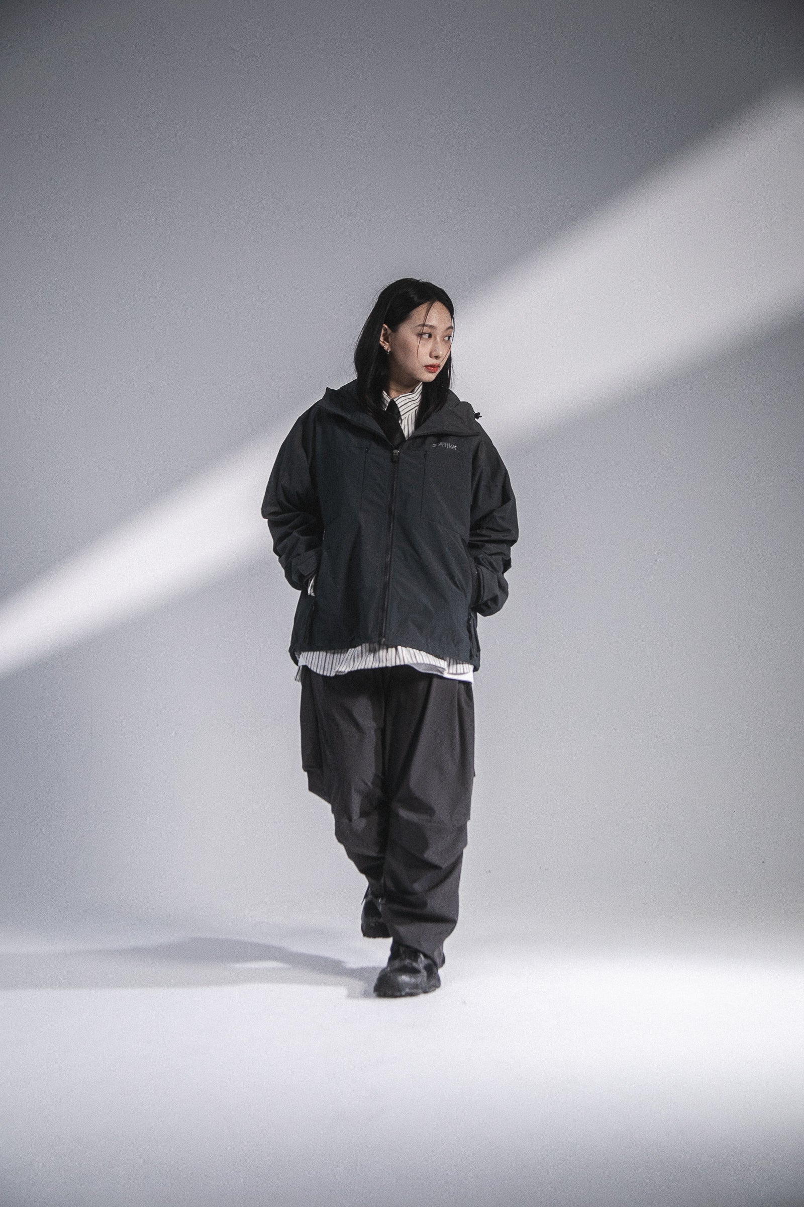本次作品採用100% Nylon面料,內裏配置舒適親膚材質給予裡外應和的穿著體驗,