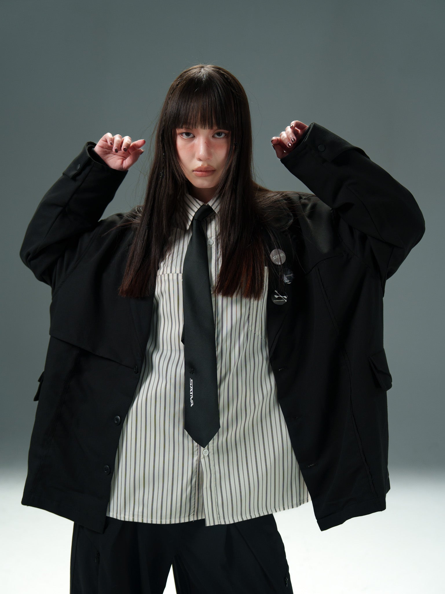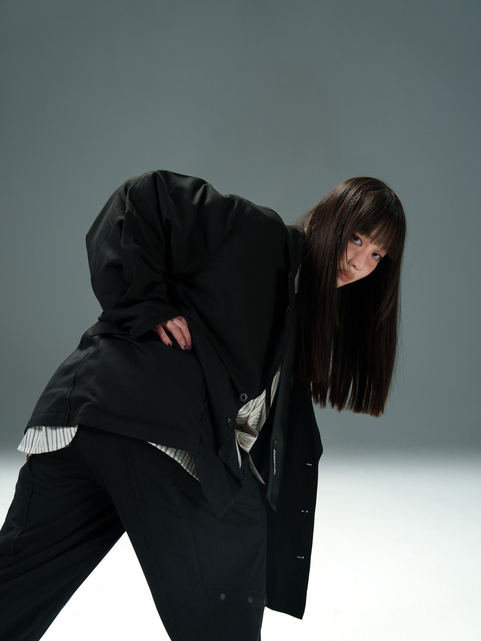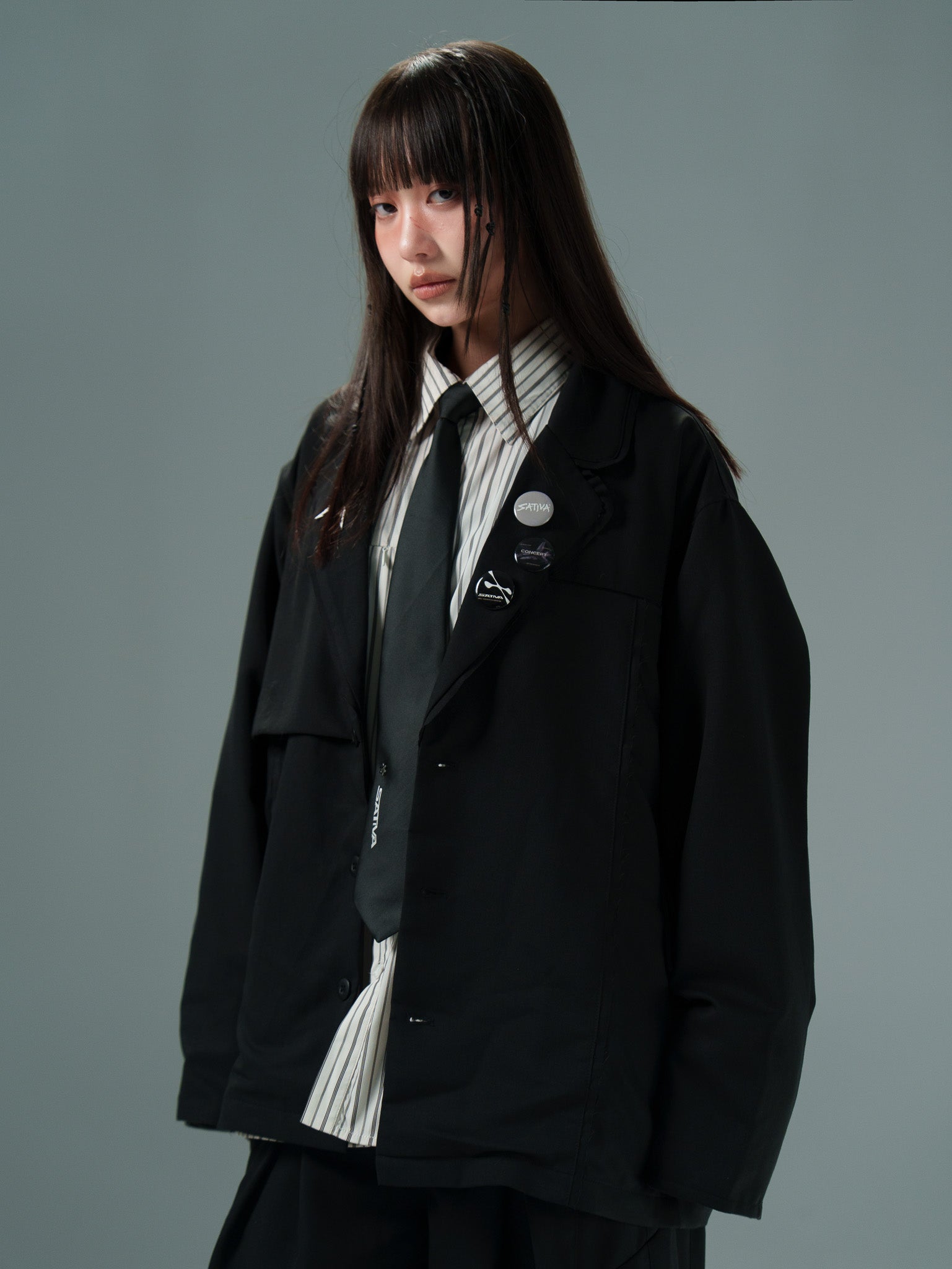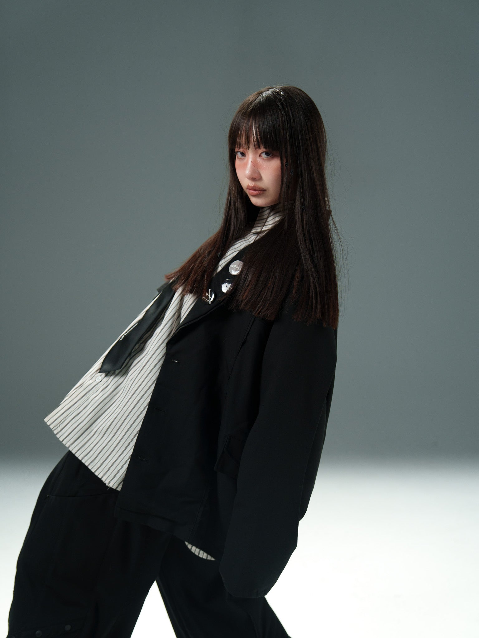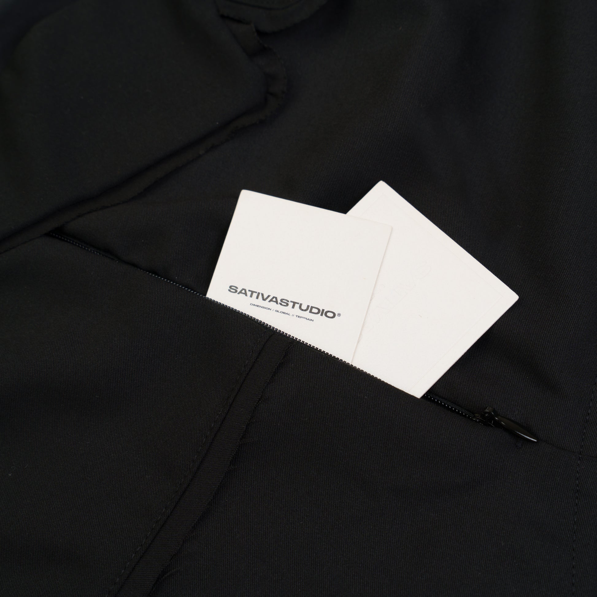 西裝素來象徵既隆重又素淨場合所需之單品,SATIVASTUDIO藉此概念打造一款正裝單品,運用熟稔慣用的解構手法,將「西裝」單品進行重塑。“Blazer”系列沿用美式西裝既正式又休閒的穿搭氛圍,將多層次拼接實踐於西裝正品上,旨在創作一款能夠作為日常輕鬆穿搭的實用單品。而在此其中的“SJ-01”結合我們過去嘗試過的輪廓版型和剪裁設計,將西裝面料徹底地進行改造,期許它能將我們的實驗精神—Urban Outfit落實,以莊重且不失格調的氣場,走入街景之中。