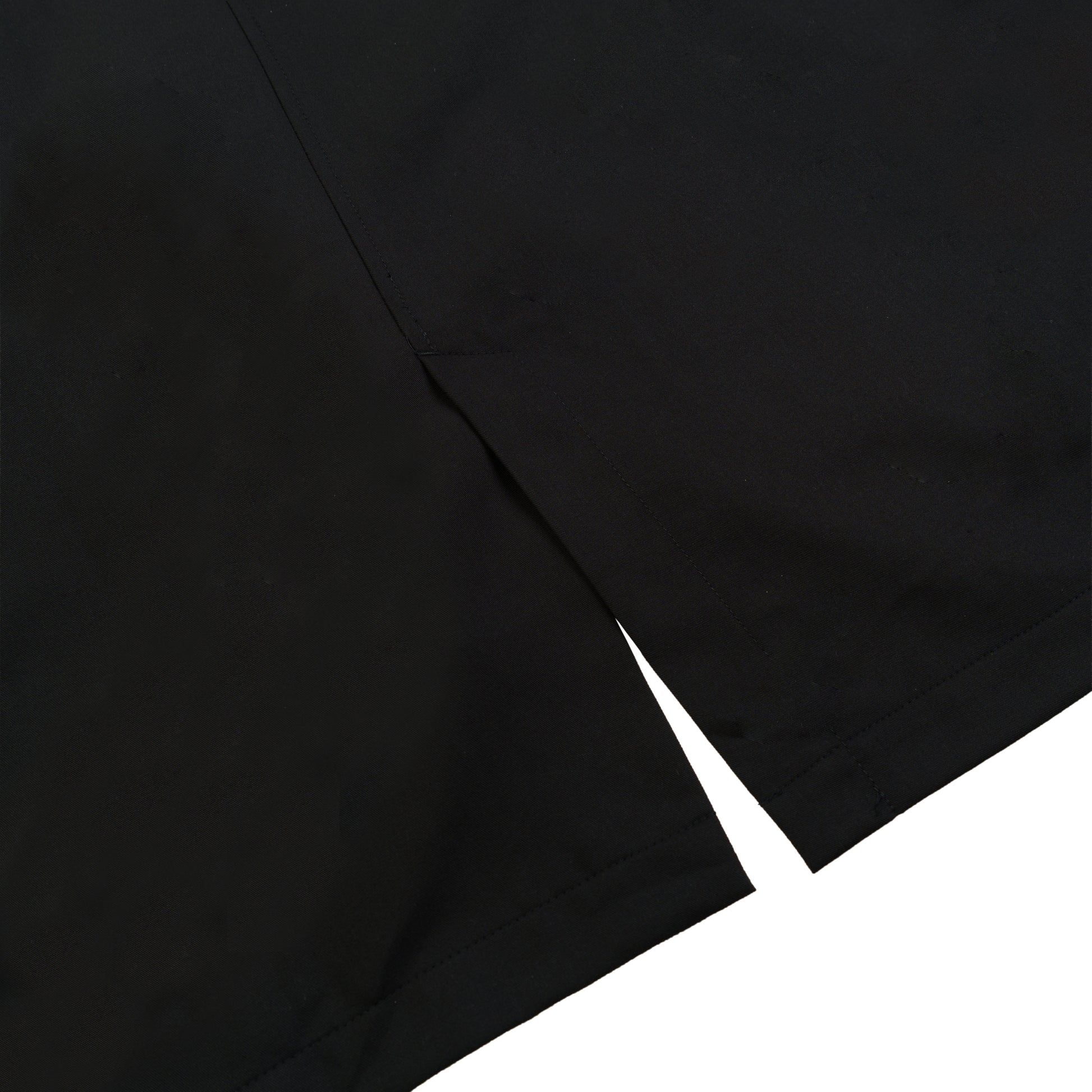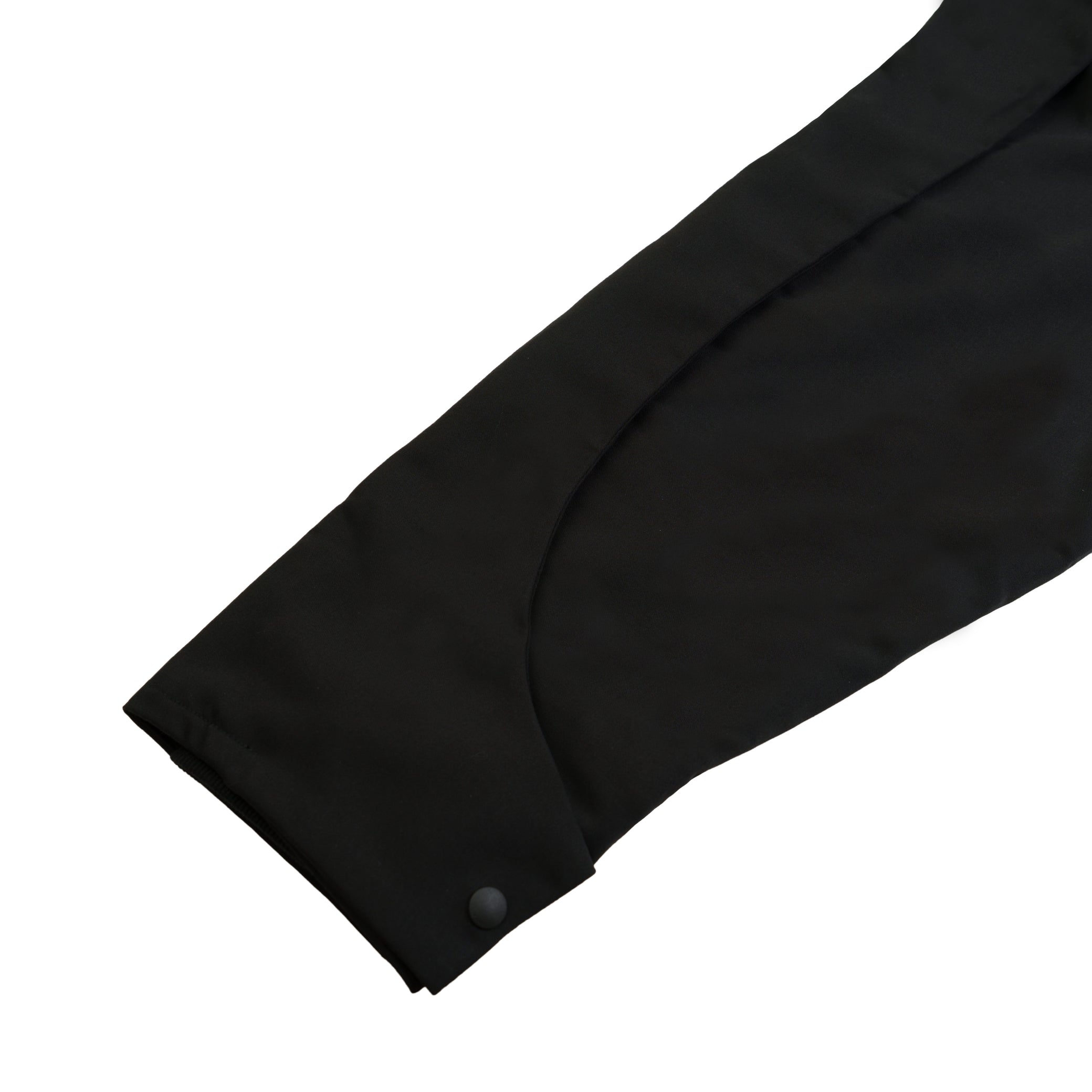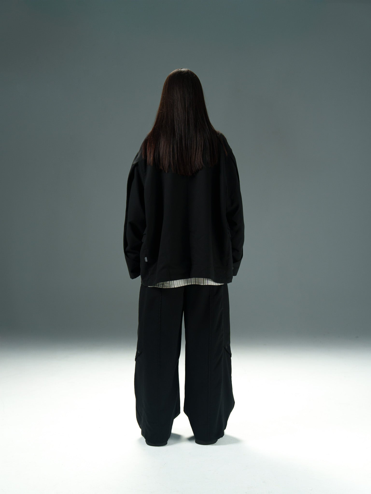 本次作品採76% Polyester、20% Cotton和4% Spandex,透過混紡材質將聚酯纖維的強韌耐磨與不易皺折發揮至極佳,並融入棉布材質的柔軟親膚與舒適透氣,擺脫穿著西裝既有的不適之感。此次作品版型設定為寬鬆輪廓,在多個拼接剪裁處增添抽鬚不收編設計,使其在素淨面料之奢簡兼具。在手袖處,我們嘗試將鬆緊羅紋與西裝袖口進行交織;且在兩側口袋輔以雙層口袋設計,將解構手法貫徹其中,期許期能帶有西裝正式的氛圍,融入日常生活。