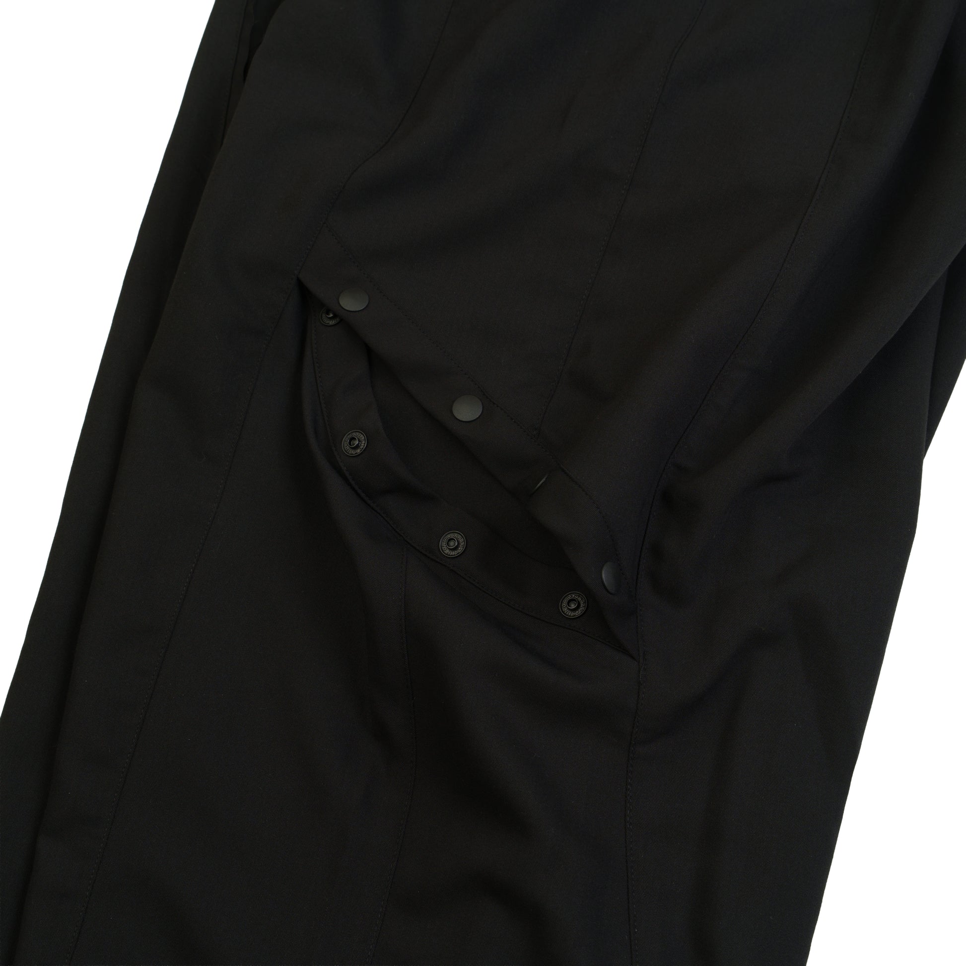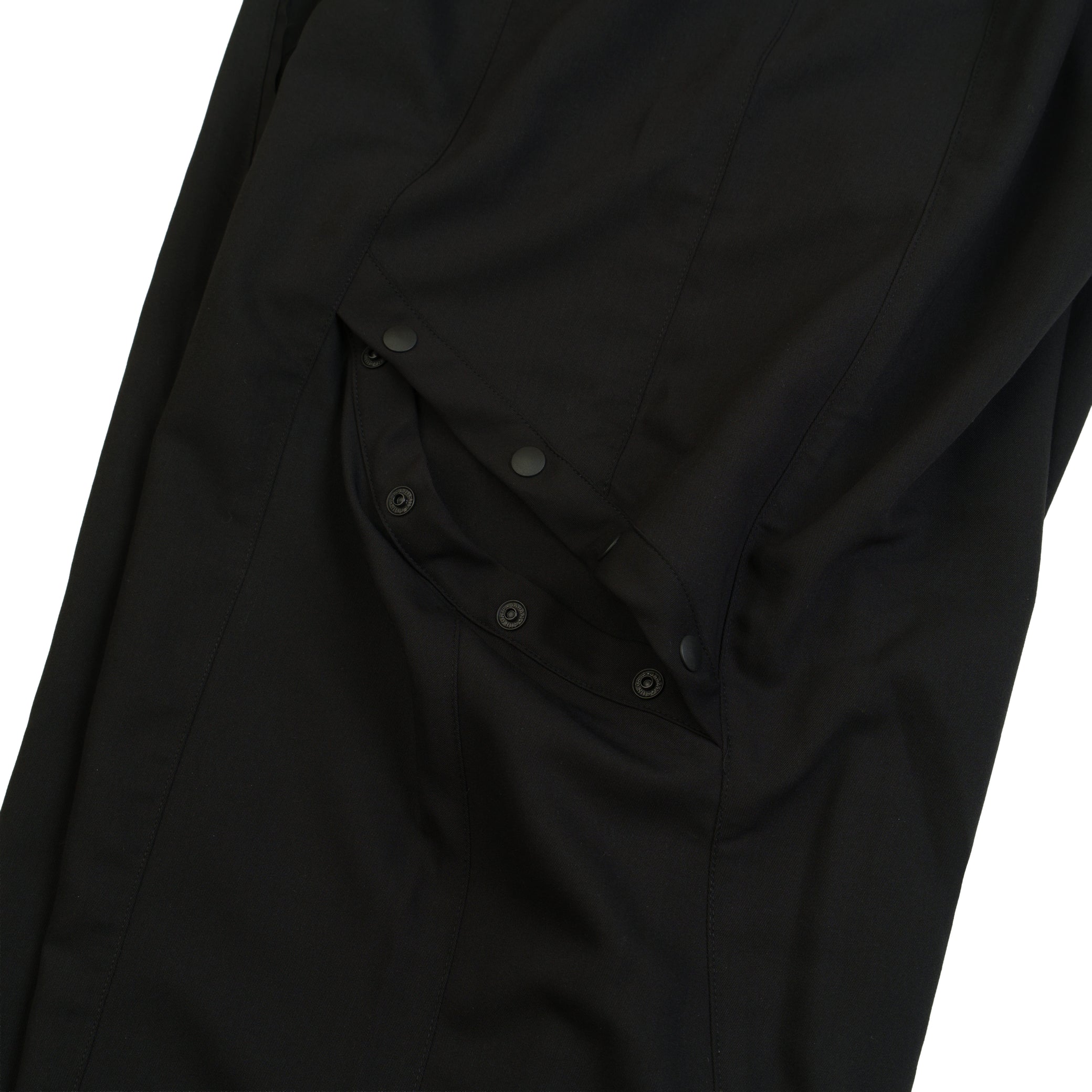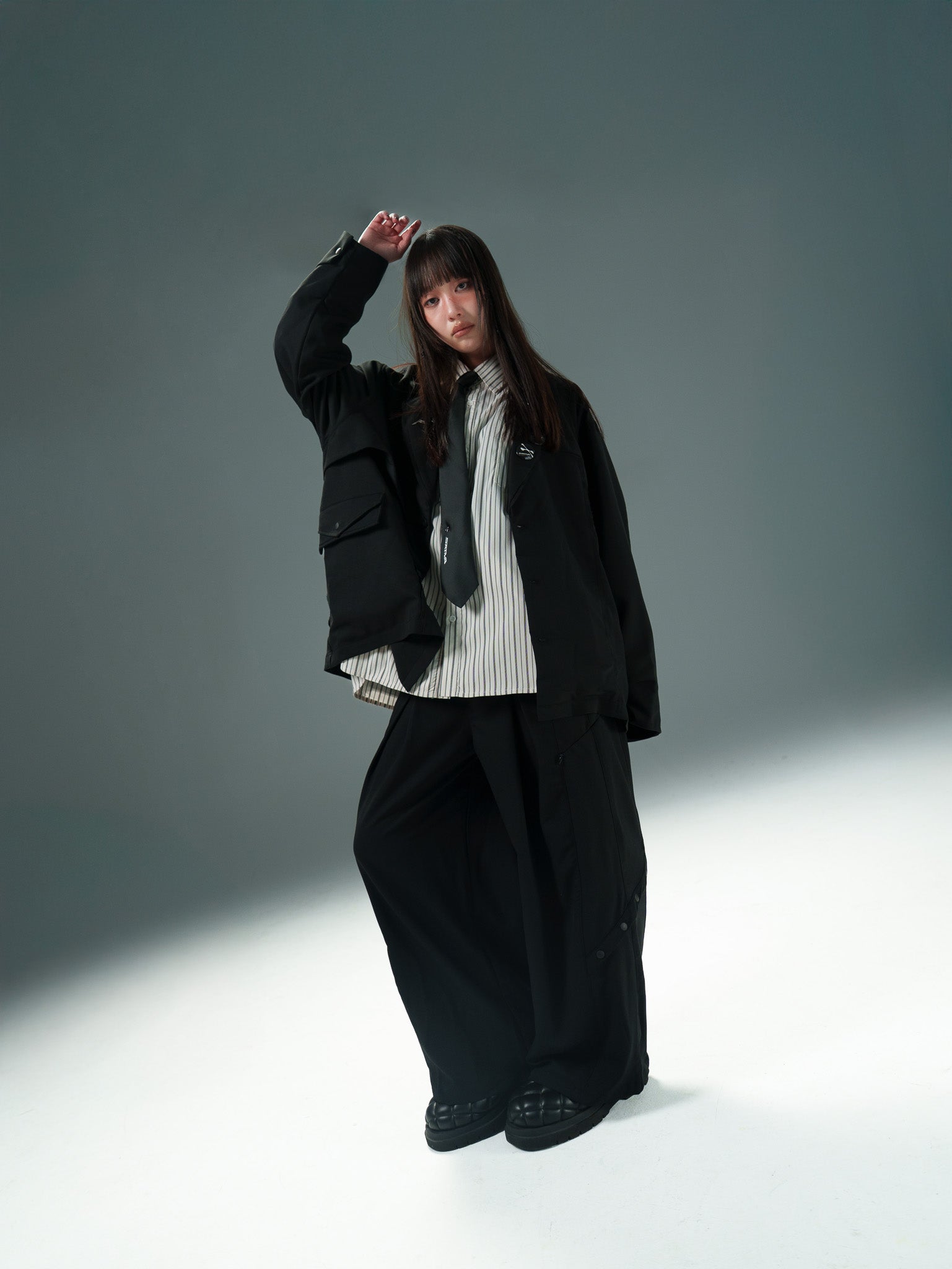 本次作品採76% Polyester、20% Cotton和4% Spandex,透過混紡材質將聚酯纖維的強韌耐磨與不易皺折發揮至極佳,並融入棉布材質的柔軟親膚與舒適透氣,擺脫穿著西裝既有的不適之感。在整體剪裁上,遍佈多層次的剪裁和抽鬚不收編設計,在西裝正式之感上添加隨性又不失禮儀的細節;褲體處,相較於傳統西褲的筆直俐落面料,我們特意用大活折設計,迎合著用者行走所需的活動性,並在大腿兩側新增水滴拉鍊,予以自由收納的需求。在小腿兩側,我們也以「四合扣設計」,供著用者自行調節,亦可點出穿搭自由性。整體而言,此次西裝單品旨在將「正式休閒」貫徹實踐,並落實在日常生活中。