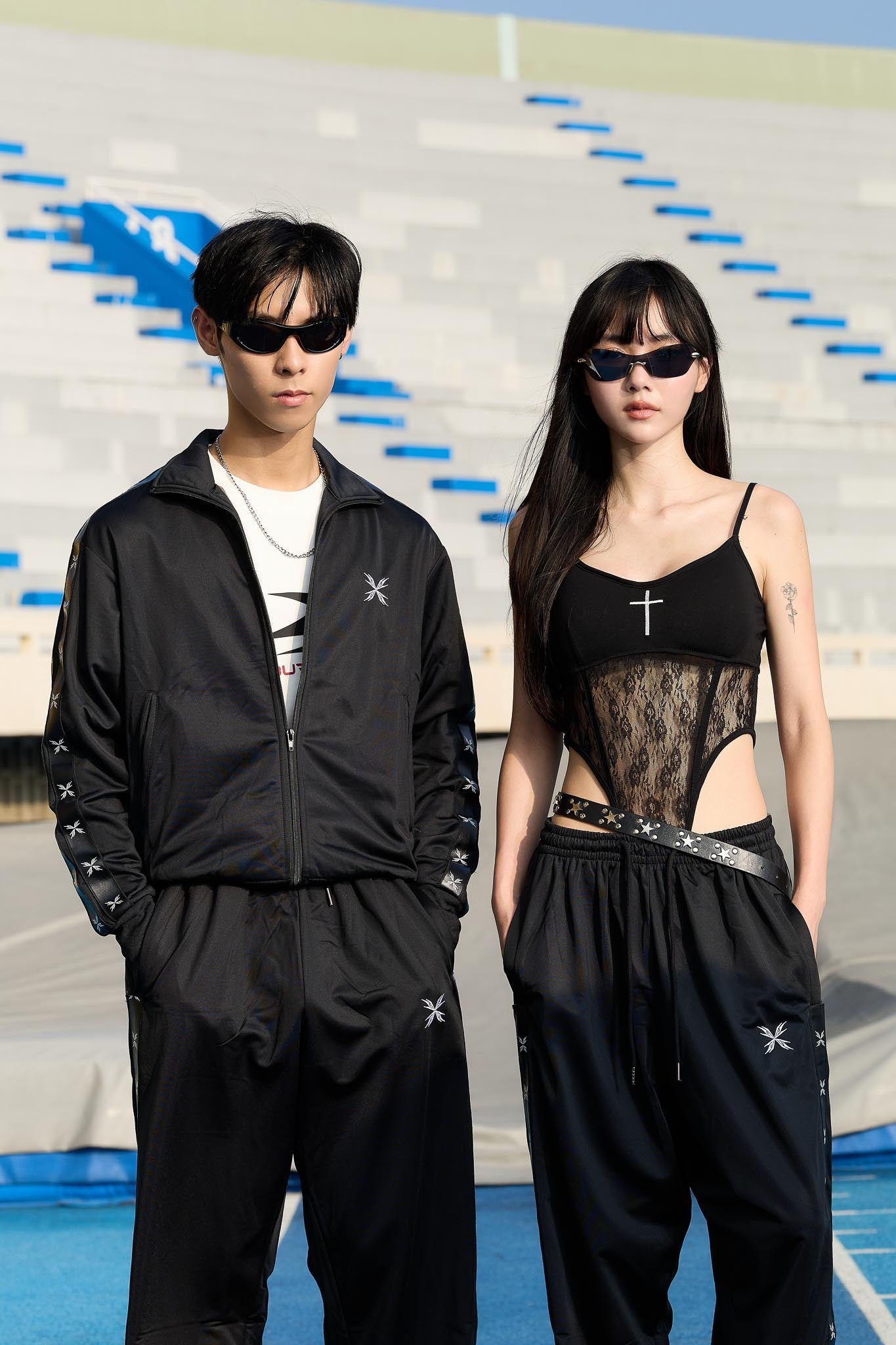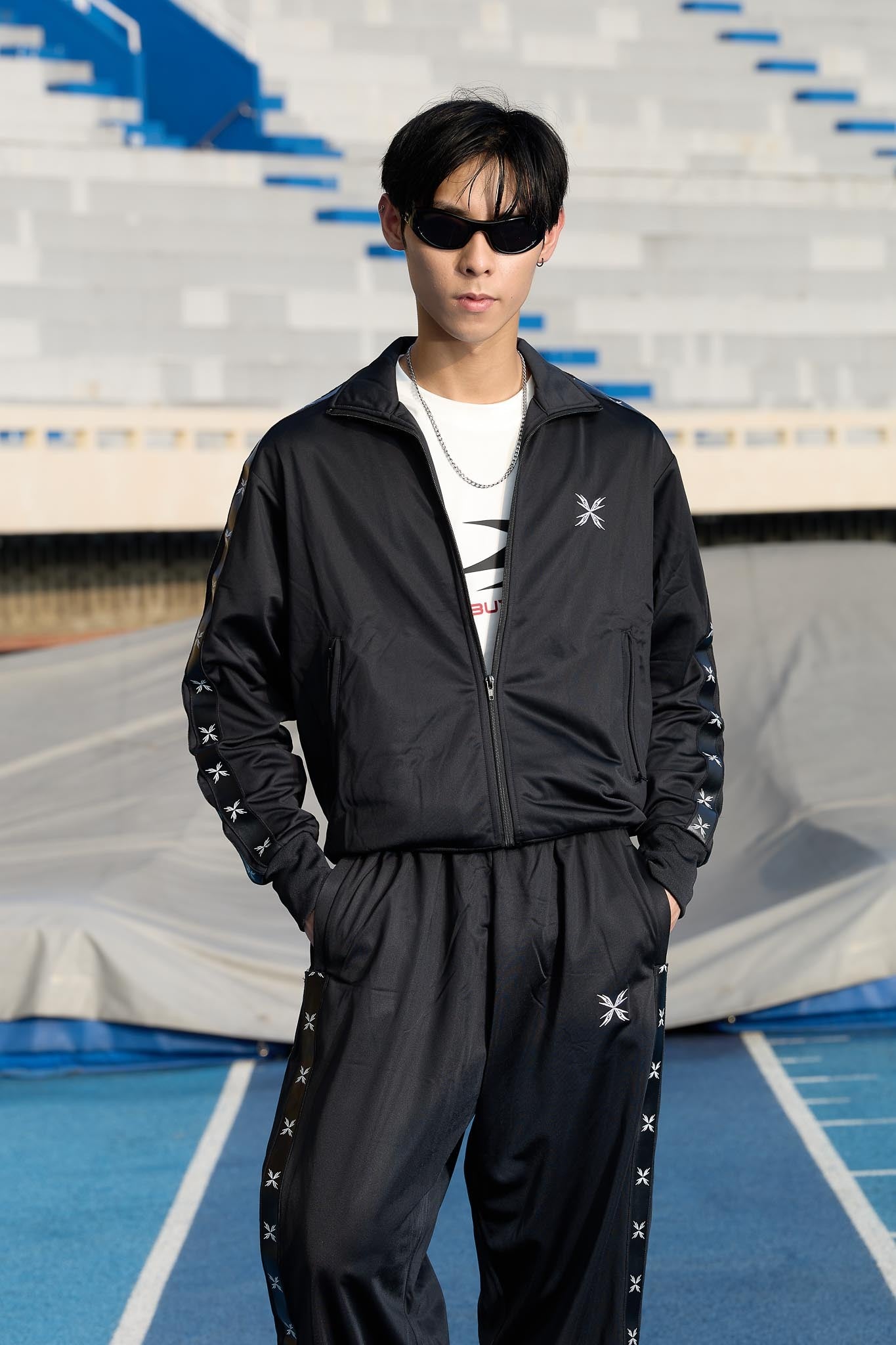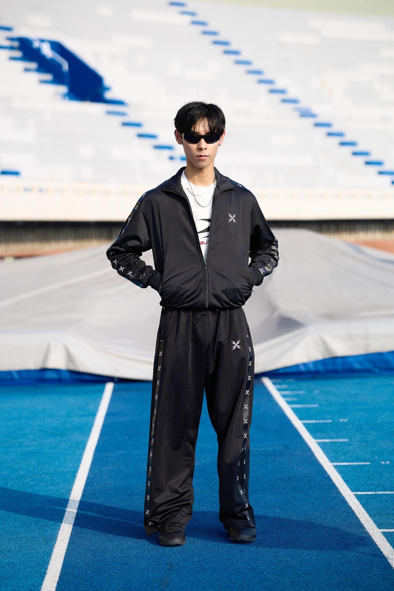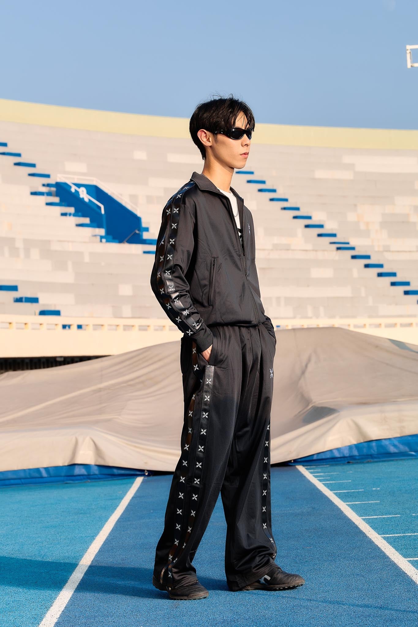 |Maintains the loose athletic contour of a traditional track silhouette.